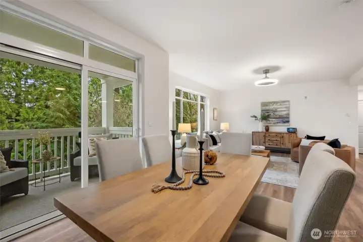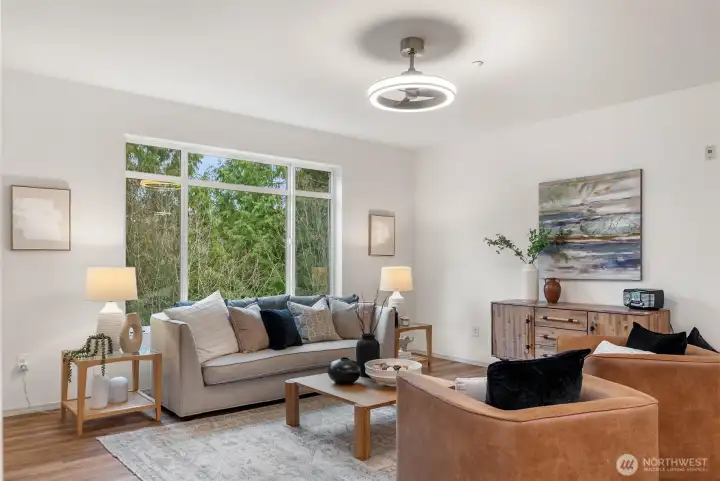 Upper-Floor Corner Retreat at Sundance Glen – Move-In Ready! Welcome to peaceful, easy living in this bright and spacious upper-level 2-bedroom, 1.75-bath residence, offering the perfect blend of comfort, convenience, and a low-maintenance lifestyle—complete with a private one-car garage and elevator access for true zero-stair living. The open-concept layout connects the kitchen, dining, and living areas seamlessly, while large windows fill the home with beautiful natural light. The kitchen features quartz counters and a convenient seating bar, perfect for casual meals or chatting with friends while you cook. Plus, enjoy a $5,500 credit at closing for new appliances—a great opportunity to add your own style. Slide open the door to your private deck surrounded by mature trees—an ideal spot for morning coffee, a good book, or simply relaxing after a long day. This secure, pet-friendly community offers controlled building access, shared gardens, and welcoming gathering spaces where neighbors connect. Guests will appreciate the abundant parking and the community’s flexible age policy (primarily 55+ with up to 20% of homes available for residents 18–54). Walk to Trilogy Redmond Town Center, coffee shops, shopping, restaurants, and nearby trails; the golf club course at Redmond Ridge; major tech campuses; and convenient commuter routes. Appliance package available: washer/dryer, dishwasher, fridge, range/oven, microwave $5,500. The seller will select, or the buyer may choose.
