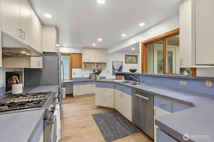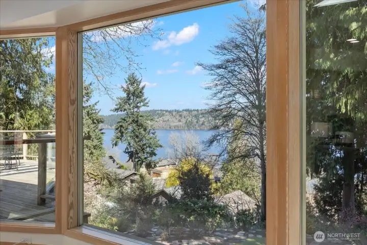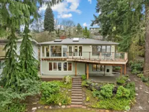 Wake up to breathtaking views of Lake Washington every morning in this beautifully reimagined mid-century gem in Matthews Beach. This serene retreat is bathed in natural light with vaulted ceilings and newer skylights on the main floor. The dining room offers functionality with a built-in cabinet and new lighting fixtures, while new carpeting flows seamlessly into the living room, complete with a wood-burning fireplace. The spacious kitchen features stainless appliances, tons of storage as well as a pantry. Off of the kitchen nook is a generously sized storage room—perfect for bikes, outdoor gear or Costco runs. The primary suite includes vaulted ceilings, built-in closets, and stunning lake views. The spa-like, fully remodeled bathroom has a cozy wood paneled ceiling as well as fresh tile and fixtures. The lower level boasts additional lake views, a large family room with a second fireplace, two more bedrooms, and another beautifully updated zen bathroom. Oversized professionally landscaped lot was thoughtfully terraced to enhance the natural beauty and maximize lake views. Recent upgrades make this home truly move-in ready, including new side sewer lines, remodeled bathrooms, fresh paint and carpet throughout, and rebuilt decks in both the front and back. Plus, the Burke-Gilman Trail is just down the hill, perfect for cycling, jogging, or leisurely strolls. Don’t miss the chance to make this peaceful lakeside retreat your own.