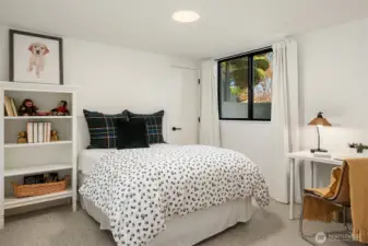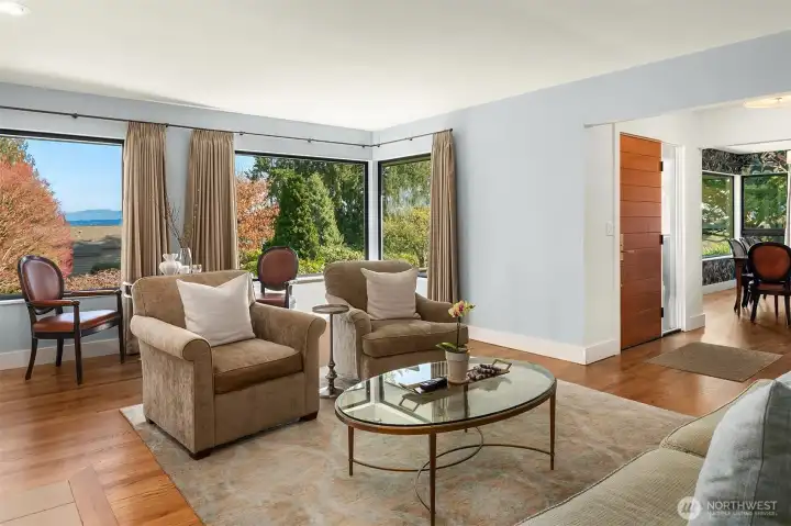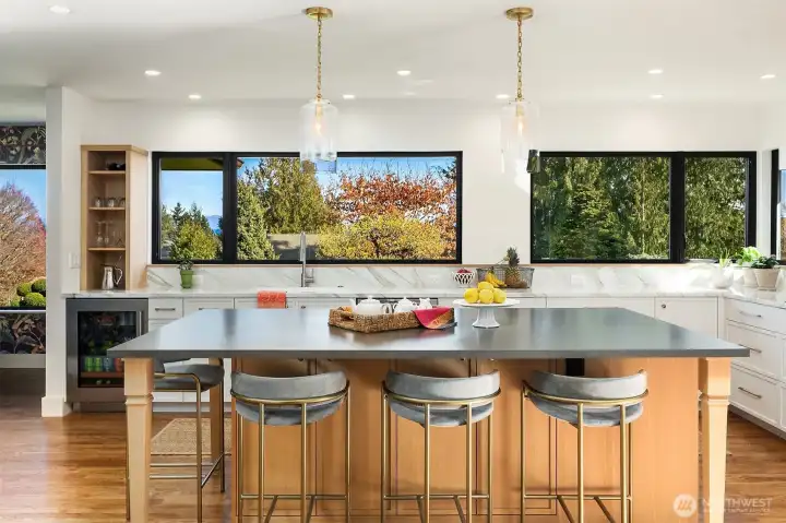 Timeless Mid-Century modern home, on a coveted street, in the heart of View Ridge! Extensively renovated and carefully remodeled retaining the classic architectural elements with modern updates. The open-concept kitchen designed for everyday living and effortless entertaining. Custom cabinets, solid surface counters, an enviable “gather around” island with seating, along with generous storage, counter space and professional grade luxury appliances- SubZero, Wolf, Miele will elevate your kitchen experience. Warm rich hardwood flooring throughout seamlessly connects main floor living spaces. Original stone fireplace anchors the the living room seen from the dining room to the kitchen through an enfilade of rooms. Main floor bedroom, primary ensuite feature french doors leading to a private outdoor space. Lower-level family room features warm wood paneled walls, brick surround fireplace, built-in storage. Ideal media room, play space or game day gathering. Two legal egress bedrooms, bathroom, exercise room, laundry and storage. Situated on a verdant true double lot. Convenient alley access finds a 2-car garage, mailbox and garbage/recycling collection out of sight. Ample on street parking for guests. Near parks, dog park, SPCC, Children's, BGT,UW, and UVill.