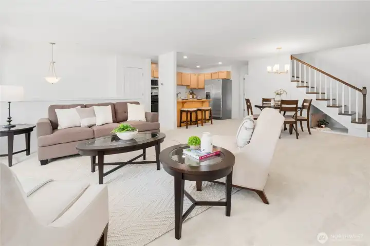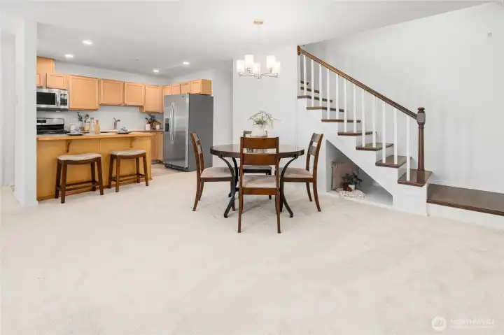 Convenient East Hill location near Fairwood! This spacious 3-bedroom townhome offers an open floor plan with engineered hardwood floors throughout the upper and lower levels, as well as the stairs. The main level features a bright kitchen and family room, plus a private primary suite with its own deck. Fresh interior paint and brand-new carpet make this home move-in ready. Upstairs, you’ll find two additional bedrooms and a full bath. The expansive lower-level bonus room opens to a private, low-maintenance yard with large patio—perfect for relaxing or entertaining. Backing to a peaceful greenbelt, this home offers added privacy and natural views. Low HOA dues of just $71/month. Two-car tandem garage with ample storage. Located in the Kent School District.