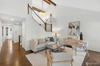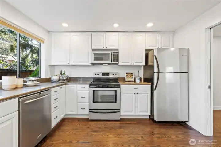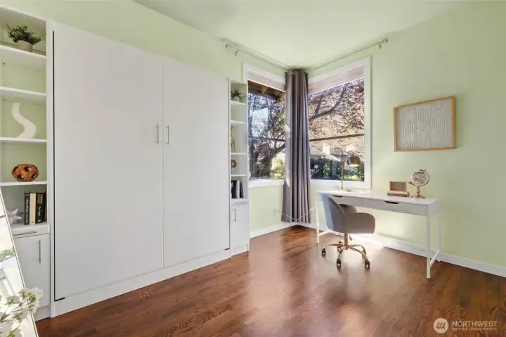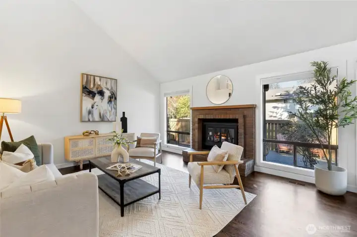 Experience a lock-and-leave lifestyle in this sun-drenched Craftsman townhouse, nestled within the serene Inglebrook community. Sharing only a garage wall, this 2BR/2BA residence lives like a single-family home, offering rare privacy and a sprawling floor plan just 12 blocks from Microsoft. Stepping inside, you are greeted by an open, airy layout featuring soaring vaulted ceilings, elegant oak hardwood floors throughout, and a large living room anchored by a cozy gas fireplace. Renovated kitchen boasting granite countertops, hardwood cabinetry, and a spacious dining area. A main-floor bedroom with a Murphy bed sits next to a full bathroom, easily converting into a gym or home office. The second floor is dedicated to the primary suite, featuring a steam shower retreat. Both bathrooms are beautifully updated with contemporary floating cabinets, sleek quartz counters and designer glass shower doors. HOA dues covers everything from siding replacement, exterior painting, roof/skylight/gutter replacement (2019) to landscaping, driveway upkeep, & master insurance w/earthquake coverage. Key highlights include fresh interior paint, central A/C, a new water heater (2026), and a 2-car garage with 2 driveway spaces plus 2 guest parking nearby. Step outside to a generous private backyard—a rare find that is perfect for pets, gardening, and outdoor enjoyment. Community amenity includes club house, athletic court and gym. Mins to Crossroad mall, and easy access to 520 and I-405.
