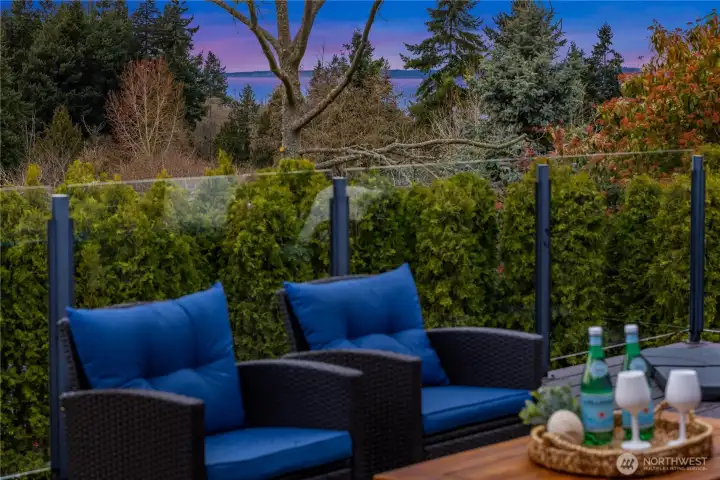 Sunset views from your private sanctuary. This expansive composite deck offers glass railings for an unobstructed view of the lush Pacific Northwest horizon.