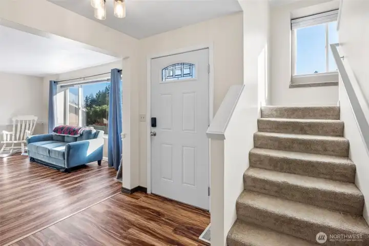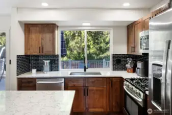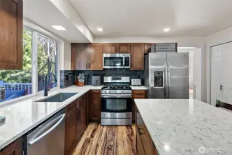 Fantastic floorplan in a quiet neighborhood, backing up to a greenbelt for additional privacy. Light and bright interior with newer flooring. Remodeled eat-in kitchen sparkles with quartz counters, stainless steel appliances, and a gas range while overlooking a cozy living room. A seamless flow to a trex deck and fully fenced backyard for optimal entertaining, year-round. Upstairs, a large primary bedroom with an ensuite 5 piece bath and walk in closet. Room for everyone with three additional bedrooms upstairs AND another full bathroom. RV/boat parking for any potential toys as well as a 2 car garage and driveway parking. Hardiboard siding, a newer roof (complete with Leaf Guard gutters!), new water heater AND a furnace! WOW! Great location in Silverdale, come and tour today!