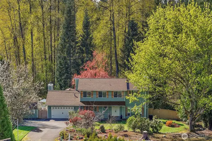 Welcome to Northridge, and this stunning 3-bed, 3-bath home, with large bonus room and attached mother-in-law suite on nearly two private acres—just five minutes from charming, historic downtown Snohomish. A grand double-door entry opens to formal living and dining that flow into a chef’s kitchen with Viking appliances, butler’s pantry, and abundant storage. Step out to an expansive deck overlooking a fully fenced yard, woods to explore, and a stunning cherry blossom tree bursting with vibrant pink blooms each spring. Main floor also has an office and half bath. Upstairs, the bonus room with full bath easily converts to a fourth bedroom, while the luxurious primary suite features a soaking tub, oversized shower, radiant heated floors, and walk-in dressing room. Two additional large bedrooms complete the upper level. The attached mother-in-law suite has its own separate entrance and functions as a full one-bedroom apartment complete with kitchen, laundry, living, and dining spaces—perfect for multi-generational living or rental income. Recent updates include a new roof in 2023, fresh carpet and exterior paint in 2026. Additional features include A/C, shed, EV ready two-car garage, and ample parking for RVs, boats, or guests. Just minutes to Boeing, Highway 2, Highway 9, easy access to 522, and ample shopping amenities including Costco, Home Depot, and Fred Meyer. Explore the 3D tour today!