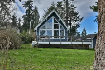 Charming 764 sq ft, 1½-story A-frame style cabin with loft, offering expansive views of Saratoga Passage and the Cascade Mountains. Built in 1979, the home features large windows, vaulted ceilings, and a wraparound deck for incredible water views from nearly every room. The main level includes a bedroom and full bath, with a loft upstairs providing additional living or sleeping space. The home was relocated at least 50 feet back from the bluff and now sits on a new foundation. Improvements include new insulation, fresh interior and exterior paint, new siding, a new deck, French drain & tightline, and a brand-new septic system installed in 2023. A Level 2 electric vehicle charger has also been added for convenience. Ideal for weekend getaways or part-time living, this property offers access to a community boat launch and private beach. This could be your Whidbey home, turnkey and ready to enjoy!