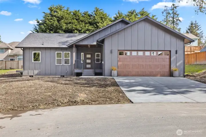 Step into a home that feels calm, functional, and ready from day one. The open layout, vaulted ceilings, and neutral palette create a light, uncluttered space designed for modern living. This brand-new custom-built home sits on a large lot at the end of a quiet cul-de-sac, elevated above the road for added privacy and presence. Board and batten fiber cement siding, Milgard windows, and a concrete driveway define the exterior. Inside, luxury vinyl plank flooring runs throughout. Modern black doors, matte black fixtures, and urban lighting create a cohesive look. The kitchen features solid wood European-style cabinetry, quartz-veined countertops, a large island, and under-cabinet lighting. The primary suite includes a walk-in closet and a floor-to-ceiling tiled shower. Two additional bedrooms feature custom glass closet doors. Energy-efficient construction and a ductless heat pump provide efficient heating and cooling. Covered front and back porches extend the living space outdoors. The yard is partially fenced and freshly seeded for grass. Just moments from the Olympic Discovery Trail, you’ll have miles of walking and biking right nearby, making it easy to enjoy the outdoors as part of your everyday routine. Clean lines. Practical design. Thoughtful finishes. Great location.