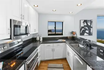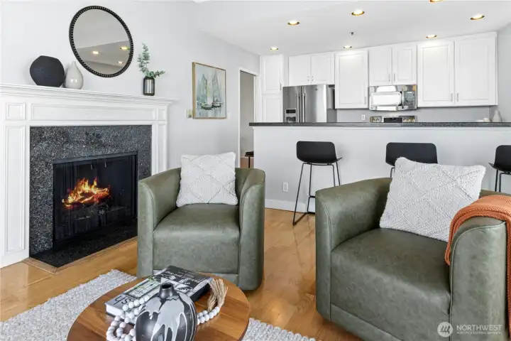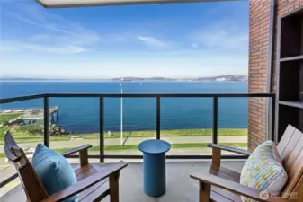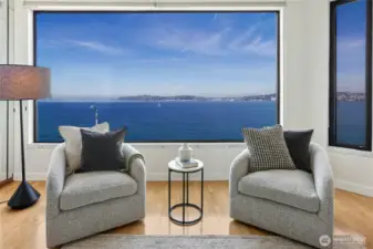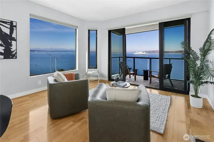 Wake up to breathtaking, panoramic views that redefine waterfront living. This exceptional residence offers extraordinary vistas of Puget Sound, where you can watch ferries glide gracefully from downtown Seattle to Bainbridge Island creating constantly changing seascapes. Beyond the sparkling water, the majestic Olympic Mountains rise in the distance, delivering unforgettable sunsets and a dramatic backdrop in every season. This corner penthouse offers an exceptional blend of space, privacy, and Northwest charm. The open kitchen and family room features peninsula seating, a cozy fireplace and private balcony, creating a warm, inviting setting for everyday living and relaxed entertaining. An oversized living and dining room—also anchored by a fireplace—provides an elegant backdrop for gatherings. The primary suite serves as a tranquil retreat, with its own balcony overlooking the peaceful, forested hillside behind the building—an ideal counterpoint to the vibrant energy of the nearby Alki Trail. Thoughtfully designed with a .75 bath and abundant hanging and storage space, it combines comfort with functionality. Two additional bedrooms and a full bath offer flexibility for guests, office space, or hobbies. A dedicated washer and dryer room, a large hall closet, and an extended gallery-style hallway to display artwork complete this distinctive and beautifully balanced home. Your indoor parking space is situated next to your storage room and your second space is in the rear.