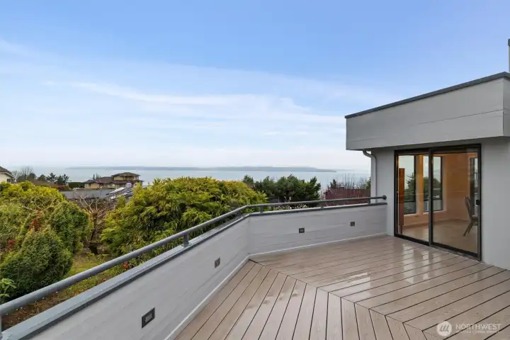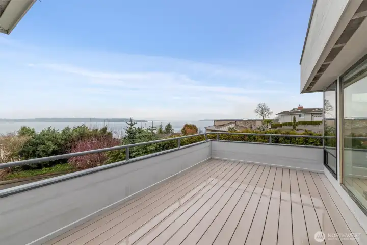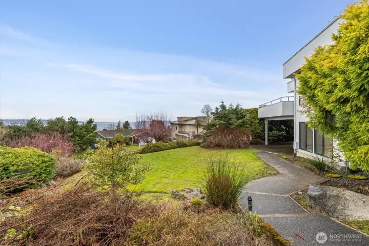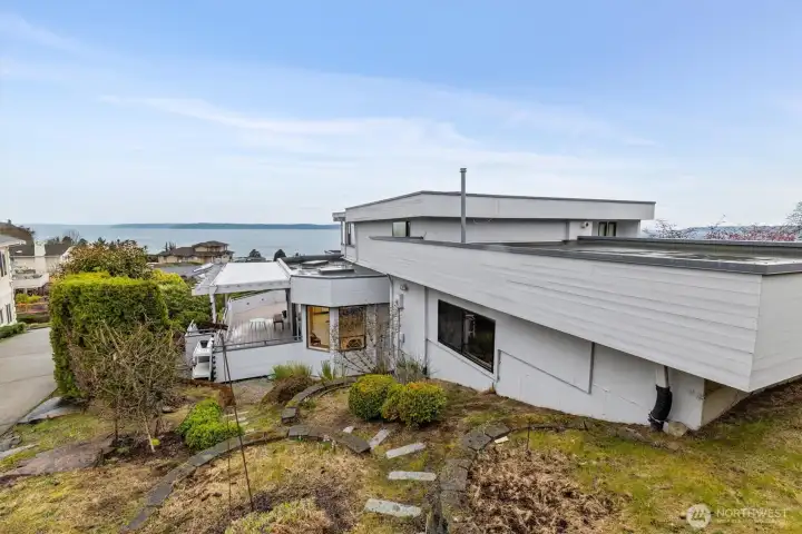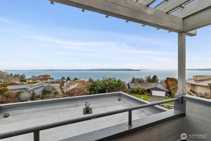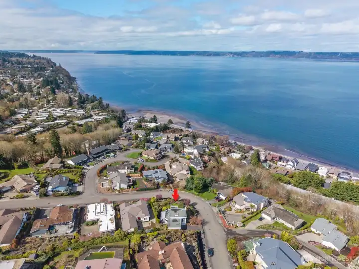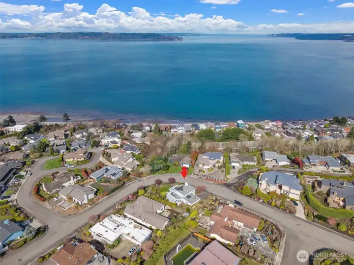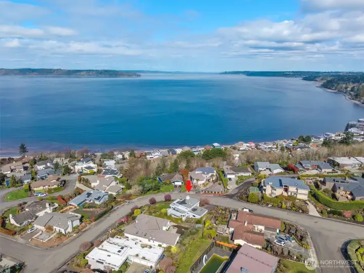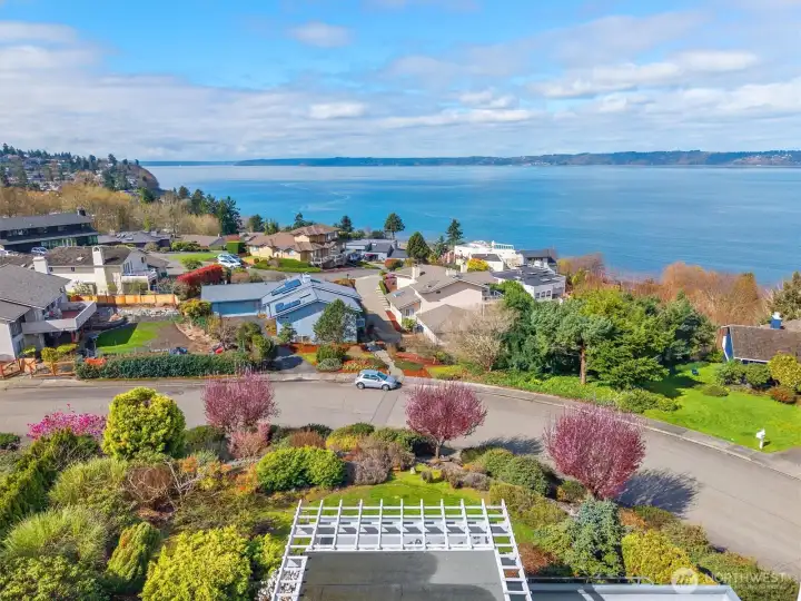 Imagine Puget Sound sunsets across your sweeping view of the sound from your private stately residence. Situated on a winding corner lot sitting high above the neighboring homes this jewel of Marine Hills commands your admiration. Spread across three levels, this home features three bedrooms including a full top floor birds nest primary suite with huge en-suite and unique central jetted tub sure to catch the water view white you relax. Main floor offers a large living room with solid natural oak wood floors, anchored by an inviting gas fireplace and an open kitchen with both a formal dining room and a cozy eat-in breakfast nook all surrounded by a wrap around deck sure to take advantage of year round wildlife and water watching. Large 1/3 acre lot with mature landscaping sits high above the street for privacy with both a flat grassy area for activities or lounging and partitioned terraces for gardening and flora. Spacious 2 car garage and A/C! Optional membership to Marine Hills swim and tennis club.