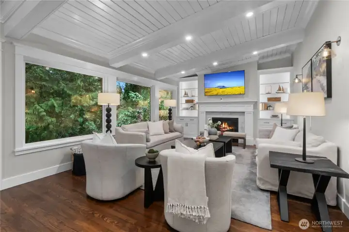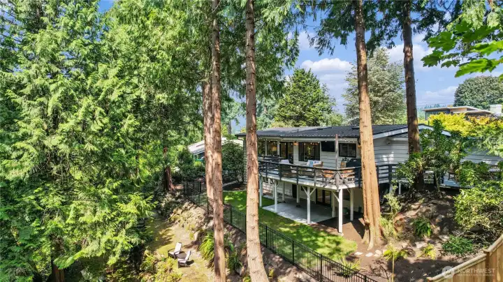 Fully remodeled West Bellevue 4-bedroom, 3-bath home spanning 2,960 sq ft, where modern sophistication meets timeless craftsmanship. Interiors are filled with natural light from skylights and expansive windows, showcasing wide-plank white oak hardwoods, crown molding, and solid wood interior doors throughout. The open-concept main level is anchored by a showpiece chef’s kitchen with professional-grade appliances, soapstone countertops, dual dishwashers, and a marble wet bar—ideal for effortless entertaining. Living spaces are warmed by an Astria gas fireplace and flow seamlessly for everyday living and hosting. The main-floor primary suite offers a spa-like retreat with heated tile floors, a Carrara marble shower, and Graber wood shutters. A second bedroom completes the main level. Downstairs, find two additional bedrooms, a media lounge with bar, and a flexible gym or wellness space. Comfort and reliability are assured with a Bryant Evolution heat pump for efficient heating and A/C, a Rheem water heater with recirculation pump, and a Honeywell standby generator. Additional highlights include a Tesla charger and integrated smart home systems controlling lighting, climate, appliances, and surround sound. Outdoors, a fully fenced backyard retreat backs to a tranquil creek and lush natural surroundings. Ideally located minutes from downtown Bellevue, Kirkland, Redmond, and award-winning schools.