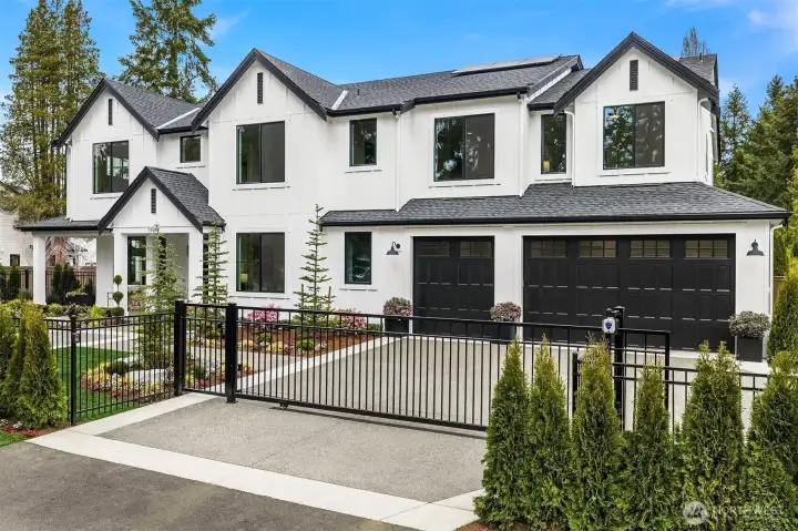 The sought-after Whitteville plan by luxury builder Murray Franklyn, ideally situated in the Glendale neighborhood of central Bellevue. This gated residence offers privacy and sophistication. Boasting 5 bedrooms, 5.5 bathrooms, and 5,174 square feet of living space, the home sits on a 18,202-square-foot lot with a generous yard. Enjoy an unbeatable location just six minutes from Downtown Bellevue, with easy I-90 and I-405 access. The open-concept floor plan showcases a spectacular kitchen that flows into the dining and family rooms—creating an inviting atmosphere for gatherings large and small. The kitchen is appointed with stainless steel appliances, an oversized center island, and a dedicated prep kitchen. Rich hardwood floors extend throughout the home. The main level features a private guest suite complete with en suite bath and walk-in closet, along with a den and versatile flex room—ideal for a second home office. Step outside to the covered patio, where a fireplace and overhead heaters provide year-round comfort for outdoor living and entertaining. Upstairs, the luxurious primary suite serves as a serene retreat, offering a spa-inspired five-piece bath and a spacious walk-in closet. Three additional bedrooms—each with its own en suite bath—ensure comfort and privacy for all. A study loft, recreation room, and generously sized laundry room complete the upper level. An oversized three-car, side-by-side garage provides ample space for vehicles. $50,000 Buyer Credit!