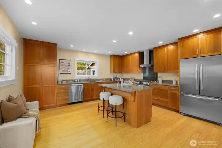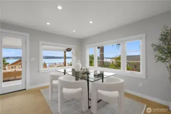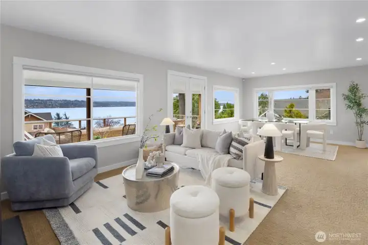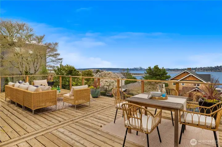 Perched high on a coveted corner lot, welcome home to a truly one-of-a-kind retreat offering panoramic views of Lake Washington, the Bellevue skyline, and Mount Rainier. From this private vantage point, enjoy front-row seats to beautiful sunrises and the iconic Blue Angels soaring overhead. This lovingly maintained classic Craftsman blends timeless charm with effortless indoor-outdoor living. An expansive entertaining deck invites al fresco dining, relaxed lounging and sun-soaked afternoons surrounded by breathtaking scenery. Inside, the spacious kitchen features abundant counter space, generous storage, and stainless steel appliances, flowing seamlessly into the open dining and living areas. Walls of windows frame the stunning views and flood the home with natural light, creating a warm and inviting atmosphere. The main-level primary suite offers everyday convenience with a large walk-in closet and a full bath. Upstairs, a versatile flex space provides the perfect setting for a guest bedroom, home office, or creative studio. The lower level expands the home’s possibilities with a third bedroom or rec room, a ¾ bath, laundry room and a large utility/storage area. With its own private access, this level presents excellent rental or multigenerational living potential. Welcome home to your calming retreat in the heart of the city, where classic character, privacy, and extraordinary views come together in perfect harmony.