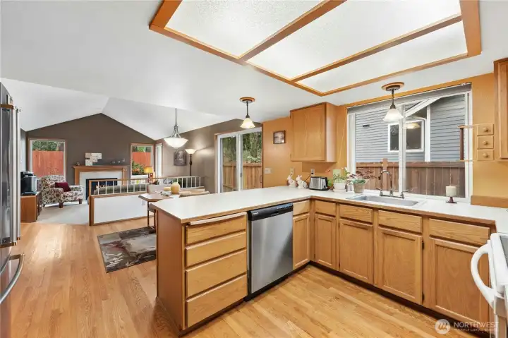 Scarborough is a highly desirable neighborhood of well kept homes with great schools and easy access to major shopping, the light rail station and I5. This quality one story home is move in ready with fresh paint, and new carpeting throughout. The spaces are open, yet defined for easy furniture placement and plenty of room for art. This home is distinguished from other homes in a similar price range with nice features like solid oak hardwood flooring from the entry through the dining room, kitchen and hallways. You will find yourself double checking the square footage on the listing because this house feels and lives HUGE. Incredible vaulted ceilings in the living and dining rooms that have large windows and skylights allowing natural light to flood the home making it hardly necessary to turn on the lights at all. The generously sized primary bedroom is also a standout with vaulted ceilings and large windows that are architecturally interesting making the space feel great. There are also double wardrobe closets and an ensuite bathroom that has recently been updated and refreshed. The yard private and backs to a greenbelt, so there are no homes behind to look, and it's fully fenced for your furry friends. There is plenty of garden space and a large patio, perfect for barbeques and get togethers. For the money, this house not only offers better features, but it is one of the smaller houses in the neighborhood, making your investment safe. And, the roof is only 5 years old.