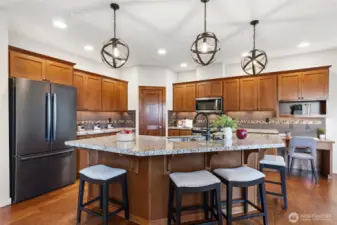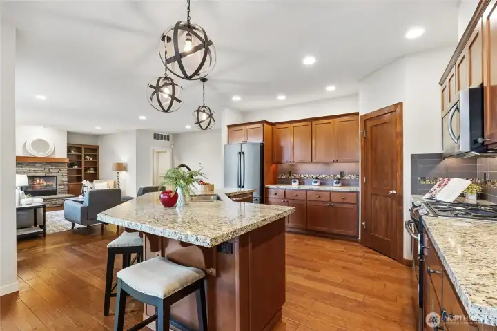 Prime Tannerwood neighborhood in North Bend—stunning 5-bed, 3.5-bath, 3480 sq ft home with breathtaking mountain views and easy commute to Bellevue/Seattle. Award-winning Snoqualmie Valley schools and a vibrant community near dining, North Bend Premium Outlets shopping, and outdoor recreation. Main floor dazzles with grand 2-story entry, rich hardwoods, elegant formal living/dining with wainscoting, and bright great room featuring built-in cabinets and cozy gas fireplace. Gourmet kitchen boasts a large island, granite counters, warm cherry cabinets, a breakfast nook, a walk-in pantry, a new Bosch fridge, and a gas range. Upstairs highlights a luxurious primary suite with a 5-piece spa bath, large walk-in closet, and serene mountain views. Dedicated office with built-ins and glass French doors. Guest bedroom with private ensuite. Three generous bedrooms surround the bonus room, shared bath, and laundry. Outdoor oasis includes a covered stone patio with a built-in wood-burning fireplace and overhead heaters, perfect for PNW evenings. Don’t miss the fully fenced backyard and storage shed. Springfree trampoline stays! Other perks include a spacious 650 sq ft 3-car garage and central AC. This move-in-ready gem blends luxury, space, and prime location—perfect for relaxing or entertaining. Embrace North Bend's active lifestyle and mountain access. Don't miss out—schedule your showing today!