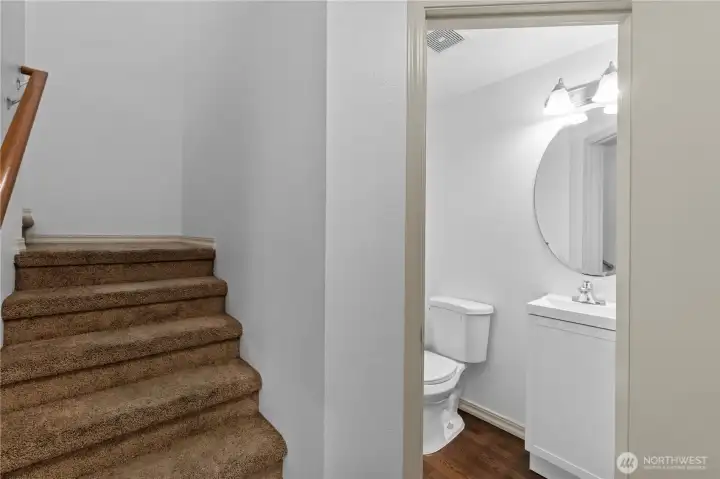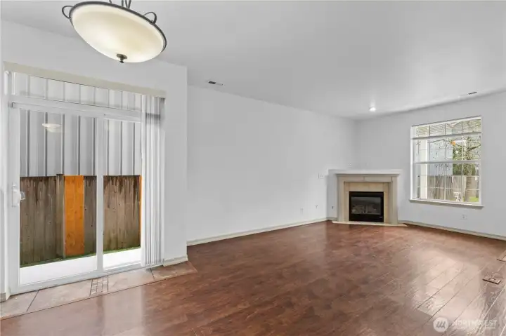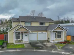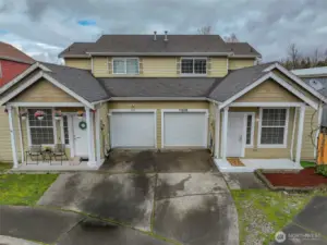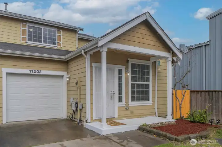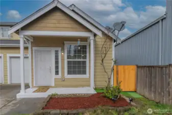 Convenient and easy living in the gated community of Village Commons! This freshly painted 1470 Square feet 2-story Single Family Attached Home features open-concept living and a bright kitchen with newer stainless steel appliances, breakfast bar, and slider leading to your private side yard with new artificial-turf for low-maintenance outdoor enjoyment. Generous size Living/Dining area with a Gas Fireplace. The convenient main-level primary suite offers a walk-in closet, large windows for natural light, and a full bath with double sinks. Updated half bath on main level as well. Upstairs features two additional bedrooms, a full bath with double sinks, laundry/utility room with the Washer/Dryer staying in the home, and an expansive landing ideal for an office-den-flex space, plus ample closet space throughout. 1 Car garage also allows for storage. Recent updates include a new furnace and new hot water tank. Located close to Joint Base Lewis-McChord, Freeways, Shopping, and everyday amenities.