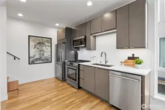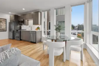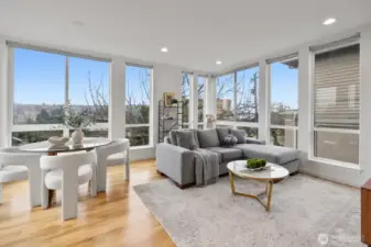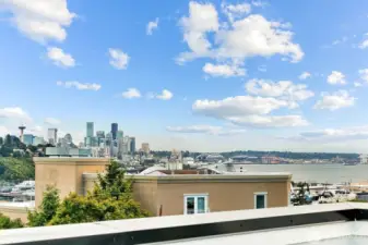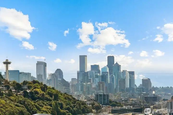 Beautifully designed end-unit home showcasing sweeping views of Downtown Seattle and Mount Rainier. This immaculate, move-in ready residence is nestled in a highly desirable neighborhood and offers the perfect blend of style, comfort, and convenience. The inviting open-concept floorplan is enhanced by designer finishes, rich hardwood floors, and abundance of natural light throughout. Expansive living room windows with motorized blinds frame the stunning views. Sleek kitchen features stainless steel appliances, custom cabinetry, and contemporary touches ideal for both everyday living and entertaining. Retreat to the luxurious primary suite complete with spa-inspired bath and walk-in closet. Rooftop deck provides breathtaking panoramic views-perfect for relaxing or hosting guest. Additional highlights include dedicated off-street parking with EV charger ready to go, an easy commute to downtown and just a few blocks from Magnolia Town Center's shops and amenities. No HOA dues. Potential assumable VA loan at 2.625%.