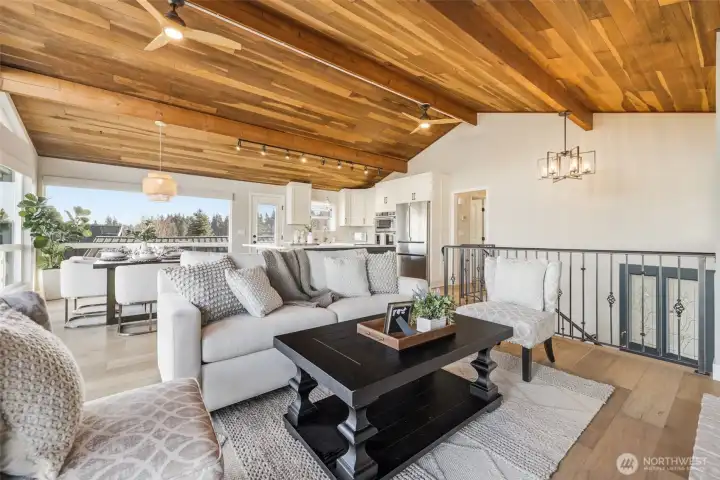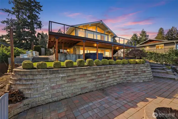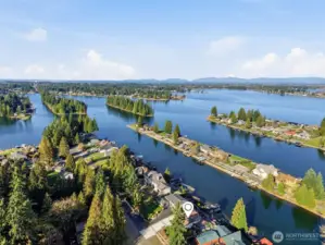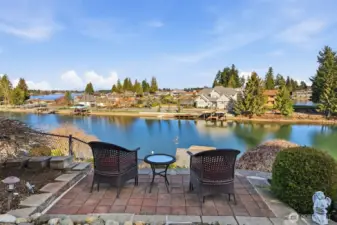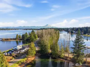 A true Lake Tapps treasure, this exceptional Lakeridge home sits above the shoreline capturing breathtaking panoramic views of Mt. Rainier, the Cascade Range, & the lake’s shimmering waters. Positioned on a beautifully landscaped .30-acre lot with 70 feet of waterfront, this property offers an incredible blend of natural beauty & refined living. The home features 4 bedrooms & 3 bathrooms with a bright, open layout designed for both everyday comfort & entertaining. The spacious living room showcases vaulted ceilings & a cozy fireplace, creating an inviting space while framing stunning lake & mountain views. At the heart of the home is the beautifully remodeled chef’s kitchen, complete with an oversized island, induction cooktop (gas ready), & quality finishes that make the space both functional and impressive. Additional highlights include new carpet throughout, a dedicated office, & two fireplaces. The primary suite features an updated bathroom with dual vanities, while the lower-level bath has been fully remodeled with freestanding tub, new tile, & vanity. Outdoor living is exceptional with a large view deck, covered patio, hot tub, & fire pit. The professionally designed grounds feature over $500,000 in landscaping, highlighted by a dramatic fountain and cascading waterfall. Waterfront amenities include 70 feet of shoreline, a private dock, & covered boat lift. Additional features include RV parking with 30 amp power hookup. Access to Jenks Park & boat launch.