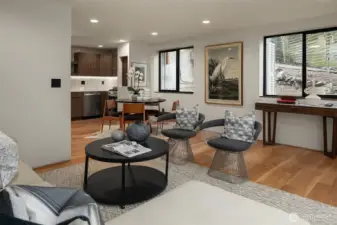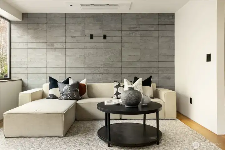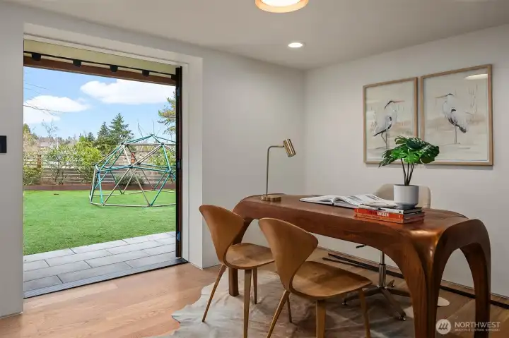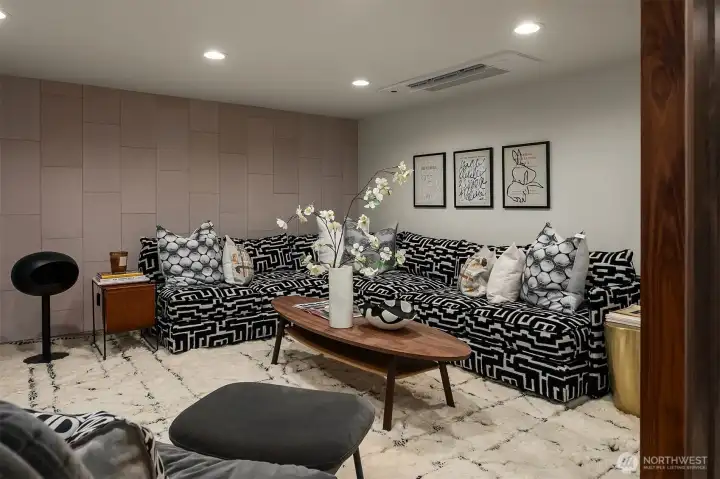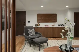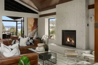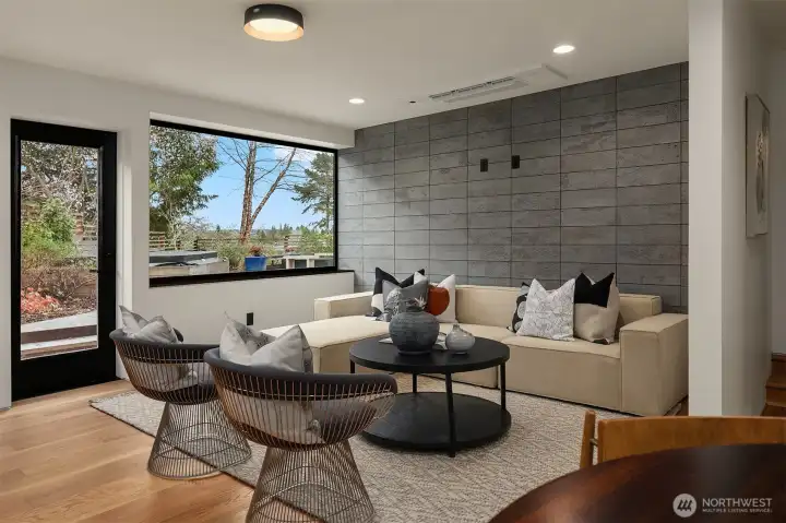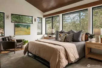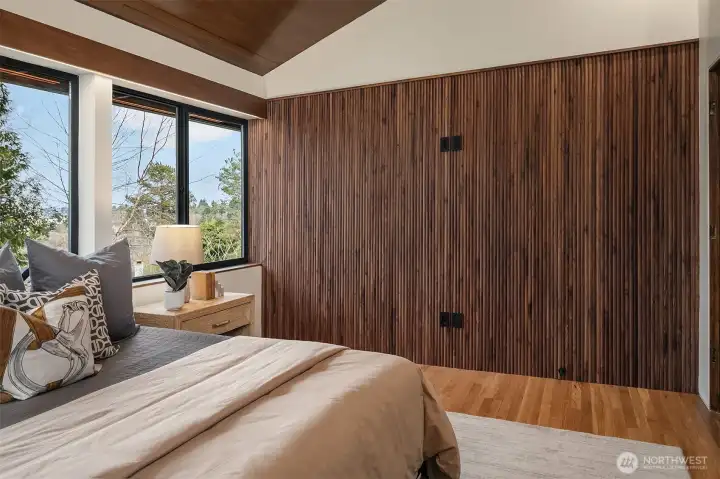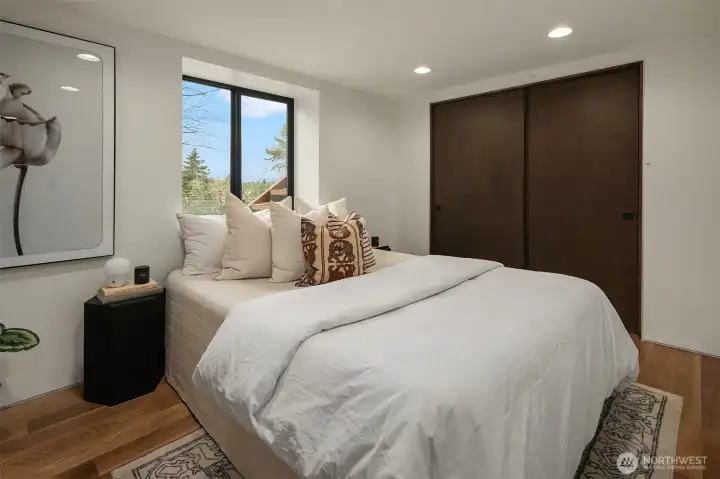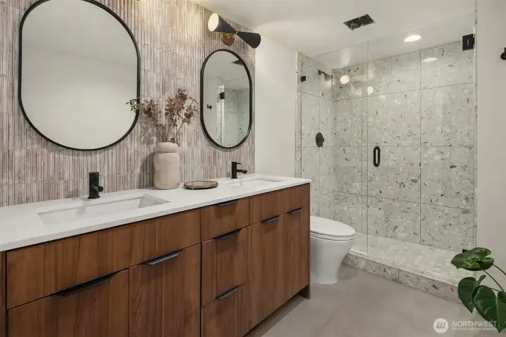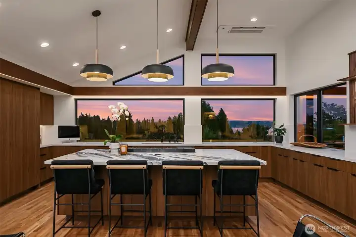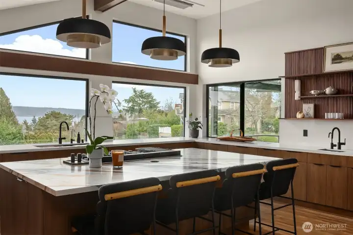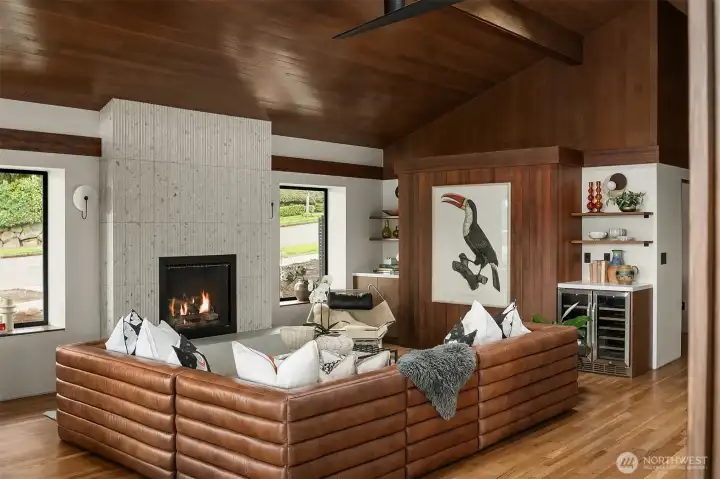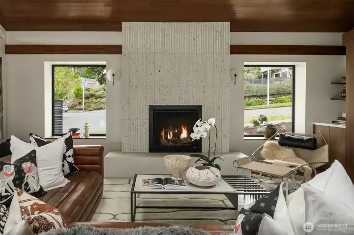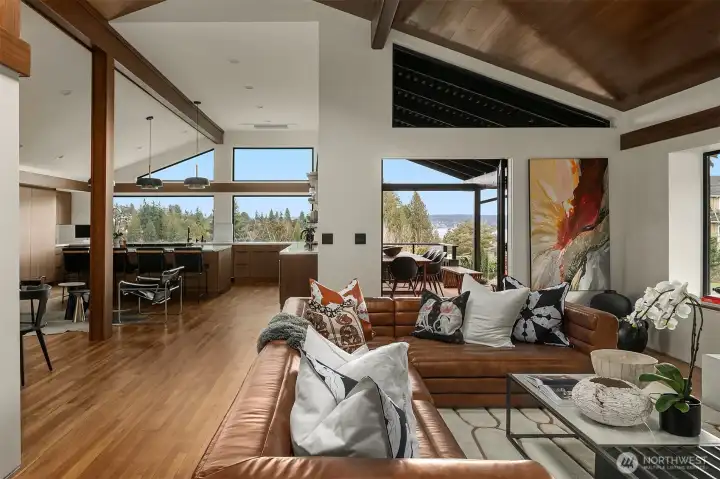 A showstopper in Laurelhurst. This designer-owned Mid-Century Modern has been completely reimagined with an uncompromising eye for detail. Taken down to the studs and effectively rebuilt, every inch reflects elevated craftsmanship, from the striking new exterior with hand-troweled stucco, metal roof, and modern landscaping, to the refined, gallery-like interiors spanning nearly 4,000 square feet. Inside, iconic original clear fir ceilings meet Calacatta Gold marble slab, real terrazzo tile floors, in-home finished hardwoods, and walls of custom cabinetry. Trim-less walls, windows, and doors create seamless lines, while statement designer lighting and a glass-cabinet dressing room deliver a level of design rarely seen. Set on an oversized triangular lot, the property captures Lake Washington views and resort-caliber outdoor living with artificial turf, a built-in hot tub, and a pergola perfectly positioned towards the Lake. The lower-level guest apartment with a separate entry features its own kitchen, living room, dining room, and laundry. Complete with a large/heated two-car garage, this is a true legacy property where architecture, design, and lifestyle converge. An exceptional home that commands attention and invites admiration.