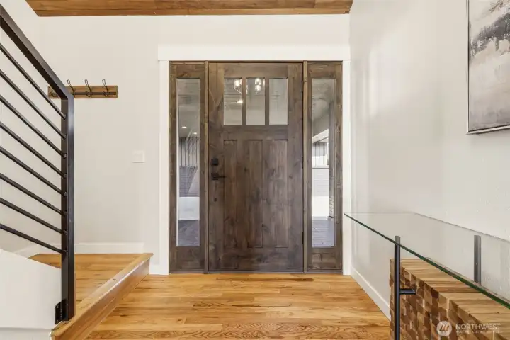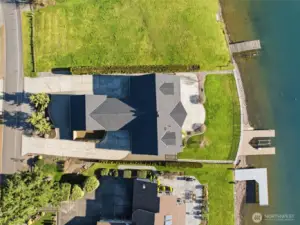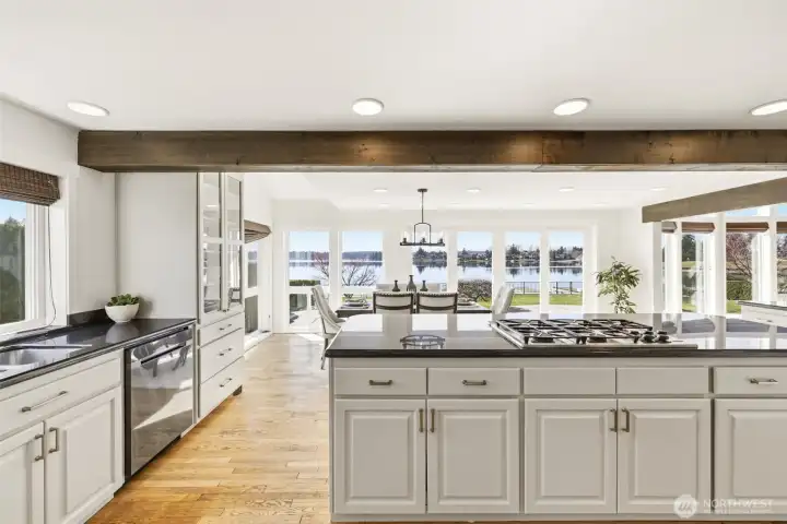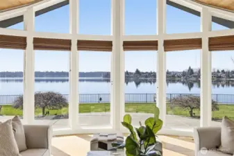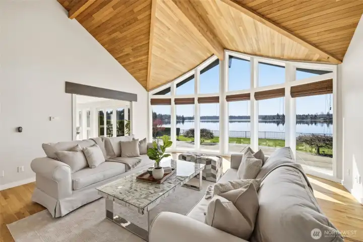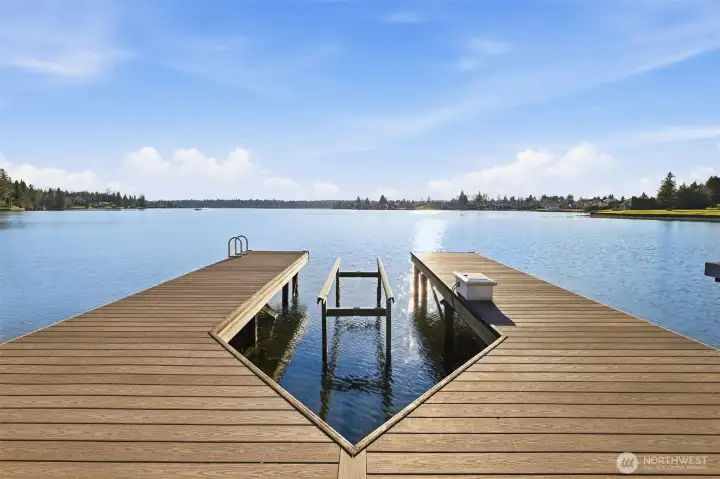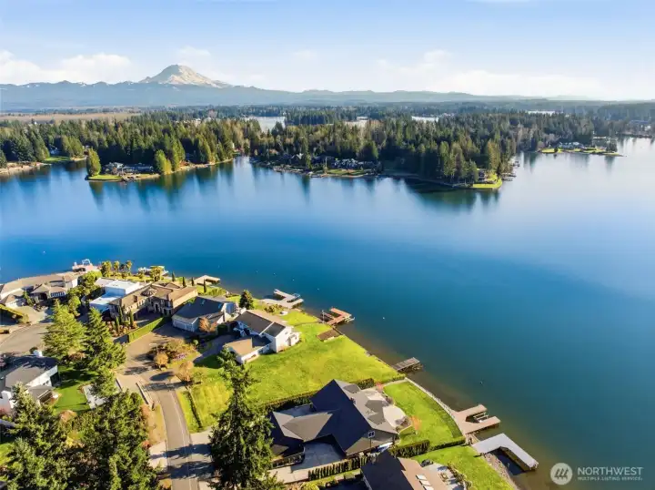 Exceptional Tapps Island waterfront home situated on a rare no-bank lot with 87 feet of pristine Lake Tapps frontage, offering sweeping open-water views and a stunning backdrop of Mt. Rainier. Designed to capture the beauty of the lake, this home offers over 3,064 square feet of living space with dramatic floor-to-ceiling windows showcasing breathtaking lake views throughout. The impressive great room features vaulted ceilings and expansive windows, creating a light-filled space that flows seamlessly to the outdoors. The oversized kitchen and spacious dining area were designed for entertaining, offering abundant counter space, a large island, and sliding doors leading to the expansive patio overlooking the lake. The main-floor primary suite features beautiful lake views, a spacious bath with large walk-in shower, and an oversized walk-in closet. A large main-floor media room or office provides flexible living space. Upstairs you’ll find two spacious bedrooms with lake views and an updated full bathroom. The flat backyard is truly an entertainer’s dream with a large patio overlooking the water, perfect for gatherings and relaxing lakeside. Waterfront amenities include an expansive dock with slip, ideal for boating and lake recreation. A detached garage connected by a portico provides excellent space for vehicles and lake toys. Presidential 50-year roof in 2023. Located in the Tapps Island community with golf, parks, and Dieringer Schools.