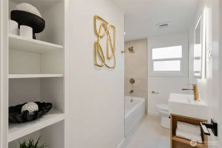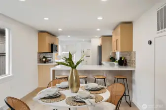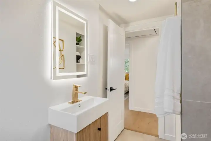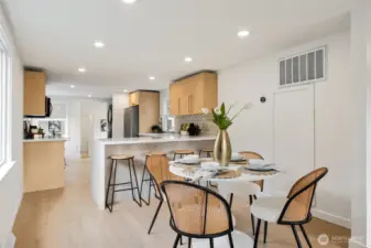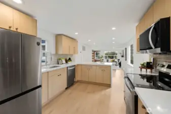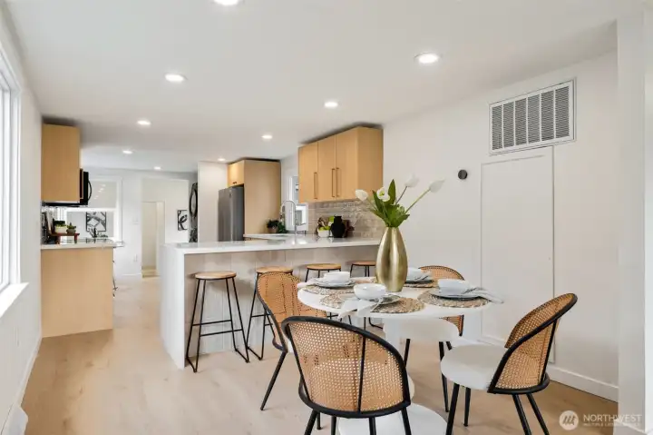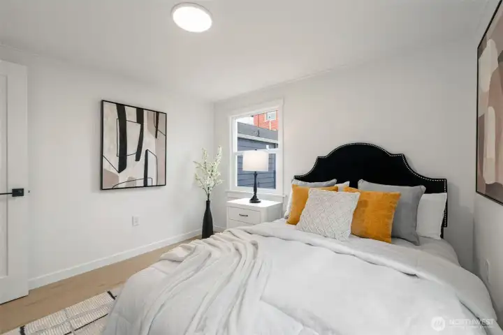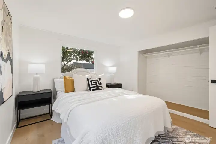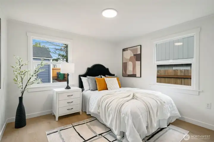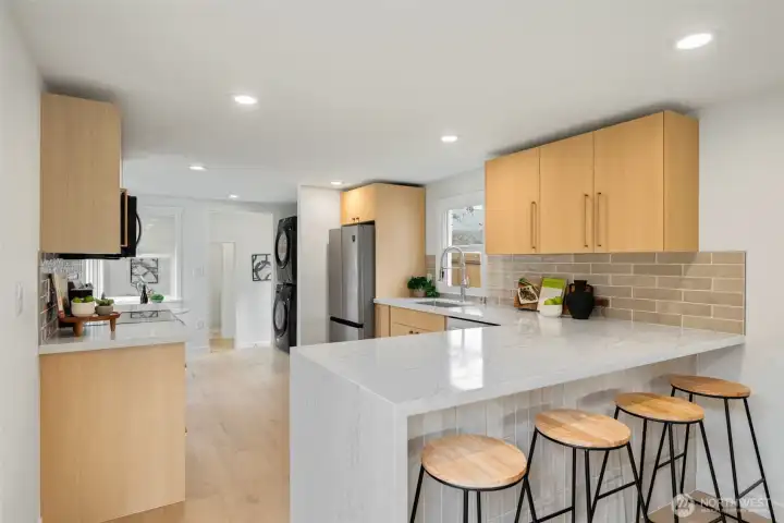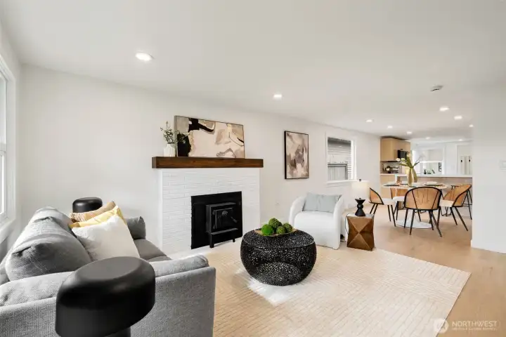 Welcome to this fully permitted freshly remodeled south facing Greenwood rambler with designer-level finishes throughout with no stones left unturned! One car garage w/ rare 4 car driveway for all your car storage needs! Enter into sun-drenched south facing living room, and warm wide-plank flooring, topped with a cozy fireplace. Wow your guests with your modern kitchen with waterfall island and brand new SS appliances w/1 year warranty. Primary suite features a large walk-in closet with a luxurious bathroom: double sink vanity, LED mirror, large walk in shower. No HOA! Large lot with a multiple areas for gardening, hosting and entertainment. New siding, electrical wiring, panel and roof for peace of mind. Private fenced yard, with a premium trex deck perfect for gatherings or quiet mornings. All just minutes to Ballard, Green Lake, Trader Joe’s, parks, SLU, and the vibrant dining scene that makes Greenwood so loved. Comes pre-inspected with one year Home Warranty! Welcome Home!
