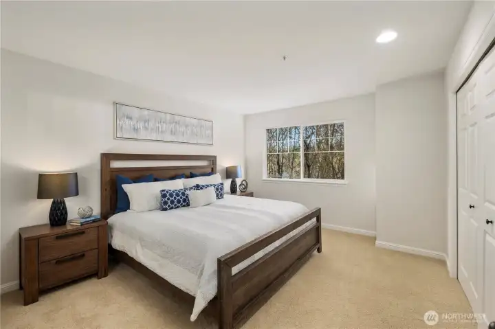 Discover comfort, style, and convenience in this beautifully updated 2-bedroom, 2.5-bath townhome in sought-after Kirkland. Fresh interior paint, new flooring, plush carpet and updated fixtures create a bright, move-in ready interior. The open kitchen offers a breakfast bar, island, slab countertops, stainless steel appliances and thoughtful finishes throughout. Radiant in-floor heating provides cozy, efficient and consistent warmth year-round. The spacious, open-concept main level features high ceilings, a welcoming living room with gas fireplace, and seamless flow into the dining area and kitchen—perfect for everyday living or entertaining. Step outside to your private deck overlooking a peaceful greenbelt with partial views of nearby Forbes Lake. Upstairs, two generous primary suites each offer their own en-suite bath and comfortable retreat. Additional highlights include secure garage parking for two vehicles, with a storage locker, and elevator access. Residents enjoy exceptional community amenities including a fitness center, clubhouse, sport court, outdoor fireplace, BBQ area, and a scenic boardwalk leading directly to Forbes Lake! Ideally located just minutes from Downtown Kirkland, Totem Lake Village, and major Eastside employers including Microsoft, Meta, Google, and Amazon, with easy access to I-405 and transit. Pet friendly, no special assessments and no rental cap makes this an excellent opportunity for both homeowners and investors alike!
