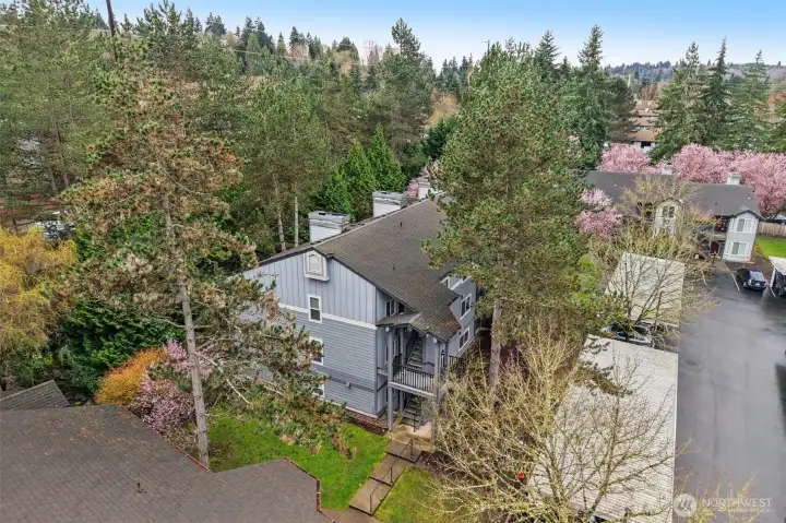 Rarely available light-filled corner unit in desirable Kirkland Place! This 2bed, 1bath condo features an open floor plan, hardwood floors, cozy wood-burning fireplace, granite counters, and a private deck overlooking peaceful park-like grounds with waterfalls and creek. Community amenities include a pool and an exercise room. Prime location near I-405, transit center, Evergreen Hospital, and Totem Lake Village with Whole Foods and Trader Joe’s. No rental cap.