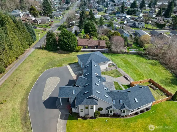 Welcome to this incredible 3,776 sq ft home situated on just under 1.4 acres with a 3-bay shop in downtown Montesano! This custom home offers a grand feel w/ vaulted ceilings, custom wood work and tons of natural light throughout. The kitchen is the focal point, loaded w/ cabinetry, marble counters & large peninsula for easy entertaining along with plenty of space for a dining table. You’ll also find a walk-in pantry, a walk-in storage room, and a built-in sound system for both indoor and outdoor enjoyment. On the main level, find a smaller bedroom or office, two half baths, one off the laundry room with exterior access. 3 steps down you’ll find the cozy family room with a built-in bar. Continue down to a private primary suite w/ backyard access, a full bath, and a walk-in close. Upstairs, walk the catwalk (with power) leading to the main primary suite, complete with a fireplace and a stunning 4-piece ensuite bath. The home is filled with custom upgrades, including window coverings and updated lighting along with a brand new roof. Through the breezeway, you’ll find the shop with 30-amp power inside and out, brand-new epoxy flooring, and a new bathroom. Upstairs offers a finished loft that is ideal for a home office, workout space, or additional hangout area with its own ductless heat pump. Backyard is ready for entertaining with an incredible concrete patio, a fully fenced yard, and space to garden with a greenhouse already in place and a circular driveway.