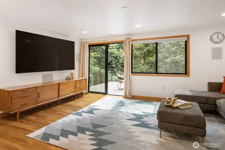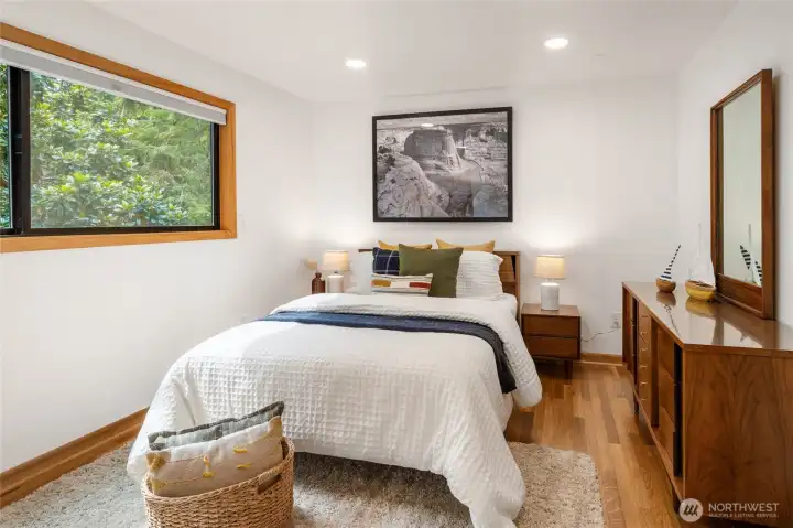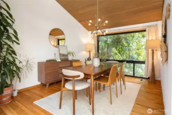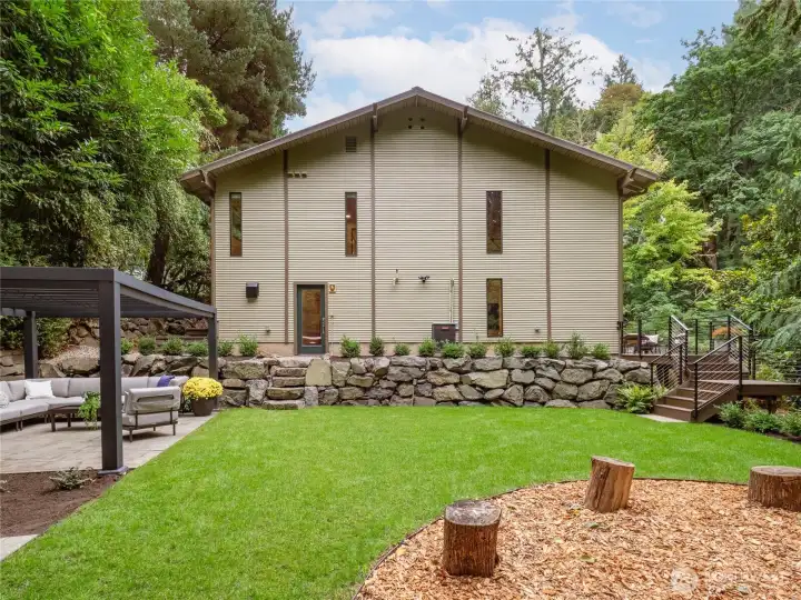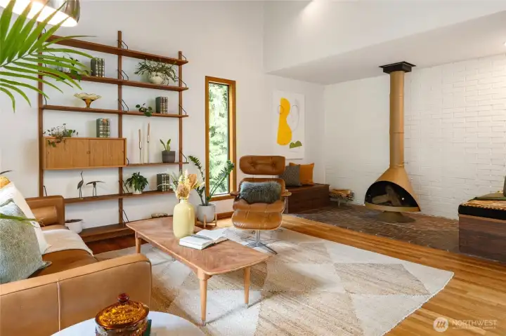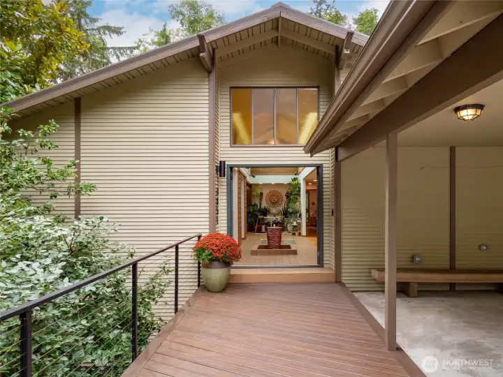Truly one of a kind! Step into the dramatic skylight atrium & experience a home that perfectly blends iconic mid-century design with modern upgrades. Thoughtfully rebuilt, the owners refinished hardwood floors, preserved vaulted wood ceilings, and chose new fixtures to complement the mid-century modern style - like black floor-to-ceiling windows & a chic Malm fireplace. Major system updates include electric, plumbing, furnace, foundation, windows, new exterior paint, EV charging & a long-life metal roof. Fantastic layout with 4 beds, 4 baths, family room, flex spaces & tons of storage. There is truly room for everyone in this house! Set on nearly half an acre surrounded by trees, this exceptionally private sanctuary features sitting areas, garden beds, a greenhouse, lawn & huge Trex deck.