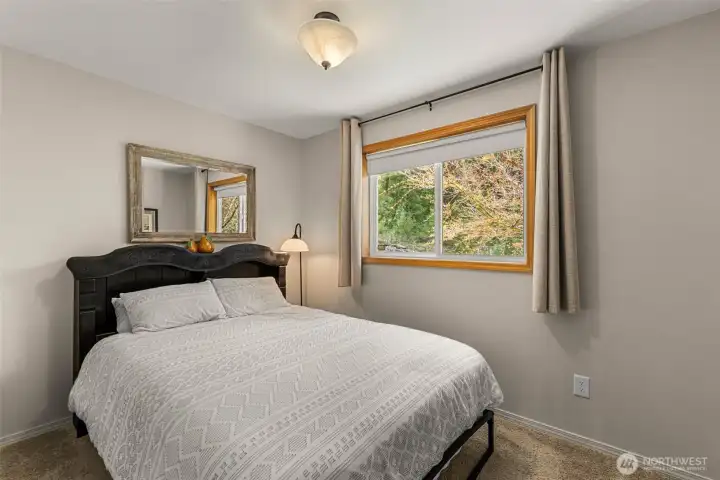 Serene primary suite filled with natural light, featuring multiple windows capturing peaceful hillside views and private access to outdoor living