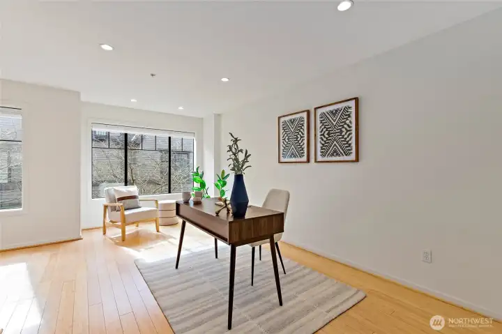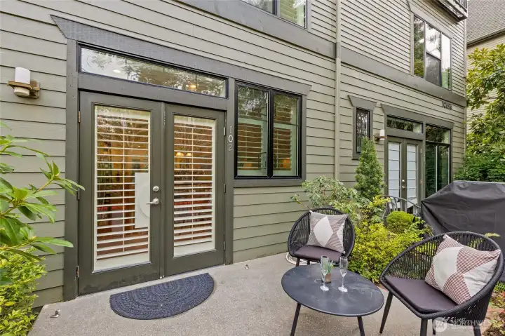 If you are seeking space, style, and location in equal measure, this three-story townhome puts you at the heart of Downtown Bellevue. The main level is designed for both everyday living and effortless entertaining — an open-concept layout anchored by a striking two-sided fireplace, a chef's kitchen with stainless steel appliances and gas range, and a patio that extends your living space outdoors. Hardwood floors, plantation shutters, and motorized blinds run throughout, giving every room a polished, move-in-ready finish. Upstairs, a spacious bedroom and full bath are complemented by a generously sized bonus room — ideal as a dedicated home office, gym, or media room. At the top, the primary suite is your retreat: a comfortable seating area, Juliette balcony, dual vanities, walk-in closet with custom organizers, and a beautifully appointed en-suite bath. Practical details are just as considered: secure underground parking with two tandem spaces, two storage units, and a newer hot water tank. All within a short distance of Bellevue Square and a short commute to Microsoft, Amazon, and Meta hubs — and served by the highly-rated Bellevue School District. This is downtown Bellevue living without compromise.