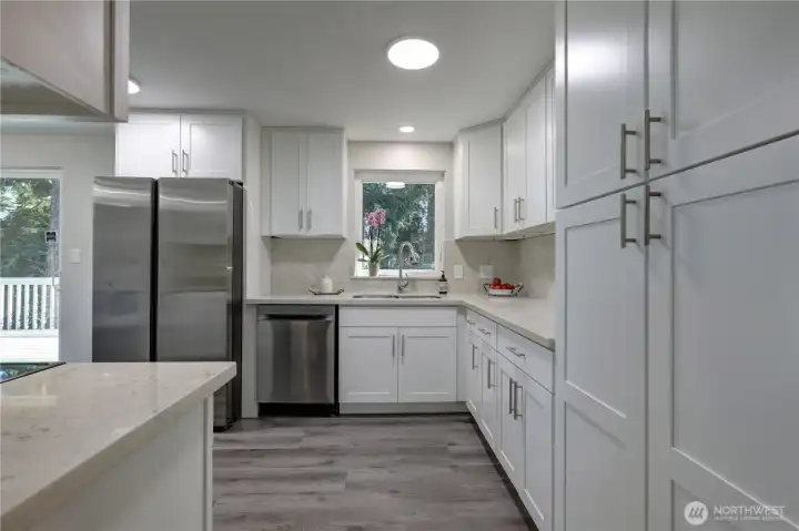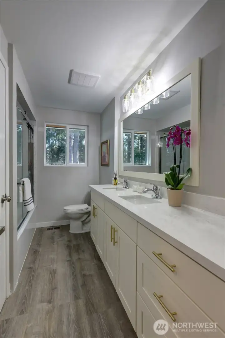 Completely remodeled, mid-century split level house is ready for your further cosmetic updates. Like New kitchen with cord counter top. New window, new floor, new garage door, new paint, new light fixture and much more. Great spacious floor plan, 4 bedrooms, 2.5 bath with new en-suite bath off primary, 3 bathrooms 2 bath upstairs. Plus lower level rec room and office/bonus room with new LVP floor, 2 fireplaces. Spacious deck off the dining room. Upstairs hardwood floors under the carpeting. Daylight walk-out basement to patio and enticing backyard with room to play and the home backs to the Coal Creek Natural Area and King County Trail System. Huge 550 sf garage. Gas furnace. Hard to find better...2,580 sf home on a 16,675 sf lot, and in the fantastic The ultimate blend of convenience and lifestyle. Bellevue School.