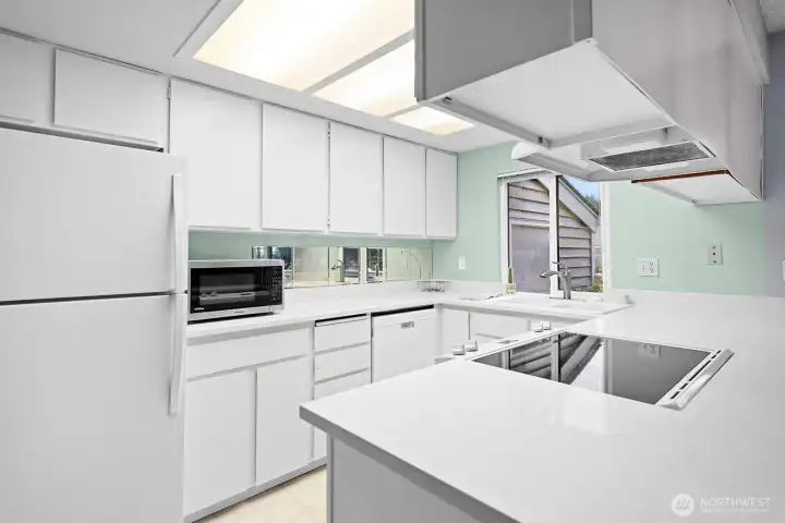 Experience ultimate privacy and modern luxury in this stunning top-floor, end-unit condo. Tucked away at the end of a private lane, this home features an oversized, light-filled living room with a cozy fireplace and a spacious dining area with built-in. Glass doors open to a massive private deck with southern exposure, perfect for enjoying the sunny, landscaped greenbelt views. Beautifully updated with new quartz countertops, a bright white kitchen with eating bar and large primary suite with walk-in closet. 2 beds/1.25 baths. Located walking distance to shops, restaurants and minutes to Juanita Beach. Two extra-large parking spots directly in front of your unit, a large storage room and in-unit laundry top off this move-in-ready gem.