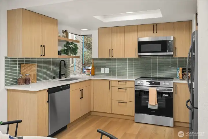 Fall in love with Lenora. This recently refreshed 4-bedroom home blends thoughtful updates with spacious, light-filled living areas. The impressive primary suite feels like a true retreat, featuring vaulted ceilings, skylights, and a spa inspired bathroom with a freestanding soaking tub, tiled shower, and clean modern finishes. Throughout the home, durable hard surface flooring and vaulted ceilings create an open, airy feel. The updated kitchen offers modern flat-panel cabinetry, quartz countertops, a tile backsplash, and stainless steel appliances - designed for both everyday living and entertaining. Bathrooms feature updated tile finishes, while recent exterior improvements include a new roof and fresh exterior paint for added peace of mind. Step outside to a private outdoor setting with a cozy fire pit area, perfect for relaxing evenings or gathering with friends.