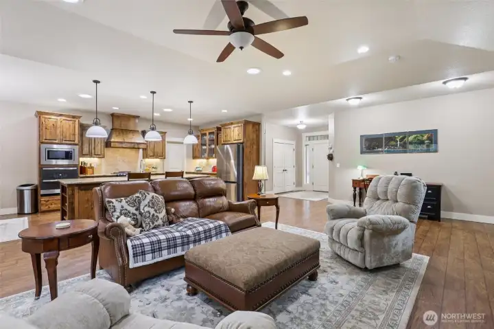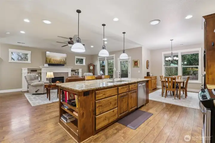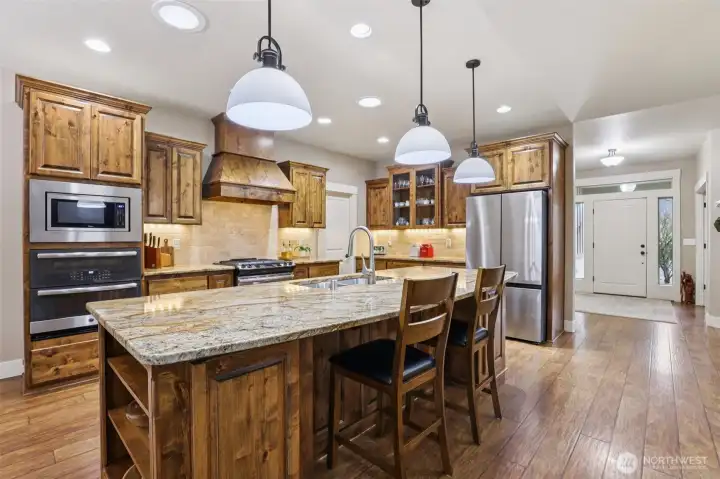 Tucked into the peaceful Pleasant Valley area, this beautifully crafted custom single-level home offers privacy, character, and exceptional design. Backing to acreage properties and framed by mature trees, the setting provides a sense of quiet seclusion while still being part of a welcoming neighborhood.The backyard is private with thoughtful landscaping, a water feature, paver patio seating area, a covered deck, and a fully fenced yard complete with an adorable garden shed. Inside, the home opens to a warm and inviting great room where a gas fireplace and custom built-ins anchor the space. The kitchen is designed for both everyday living and entertaining, featuring an expansive granite island, a gas range with a knotty alder hood vent, three ovens, and a dining area just off the kitchen. Oversized walk-in pantry. and decorative cabinets. The adjoining living area offers generous space with an additional sitting area. A private office or den provides the perfect work-from-home space. The primary suite is quietly positioned at the back of the home and includes a soaking tub, walk-in shower, and a large walk-in closet. Two additional bedrooms, a full bathroom, and a laundry room with sink and storage complete the layout. Mudroom off the 3-car garage. Beautiful carpentry and thoughtful craftsmanship are evident throughout the home. A welcoming covered front porch and the nearby Grey Hawk Ridge Park add to the charm and livability of this special Pleasant Valley property.