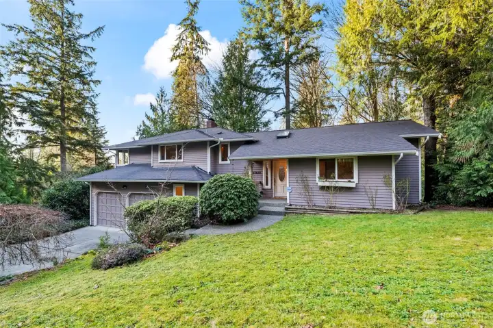 Welcome to the highly sought-after Wellington Hills neighborhood! Tucked away on a quiet cul-de-sac, this beautifully updated multilevel home blends timeless style and comfort in a peaceful, country-like setting with sunny space for gardening. Near a park with trails overlooking mountains and gorgeous sunsets, it’s just minutes from downtown Woodinville with easy access to SR9 and 522. Backing Endor-like forest, expansive decks create effortless indoor-outdoor living, perfect for morning coffee, summer gatherings, and relaxing evenings. The home's light-filled entry opens to a spacious floor plan with plush new carpeting. The inviting main living area features quality finishes and a cozy fireplace. The eat-in kitchen is a chef’s delight with stainless steel appliances, granite counters, abundant cabinetry, and a generous breakfast area. A formal dining room with wet bar sets the stage for memorable dinners and celebrations. The serene primary suite features a private view deck, attached full bath, and walk-in closet. The lower-level rec room has a second fireplace, convenient half bath, and soundproof windows – perfect for musicians, a media room, home office or hobbies. Conveniently located near local shopping (Costco 5 min), tasting rooms, dining, and within the acclaimed Northshore school district. With an efficient heat pump for heating/cooling & no HOA, this exceptional opportunity offers privacy, quality, and everyday convenience all in one home. Move-in ready.