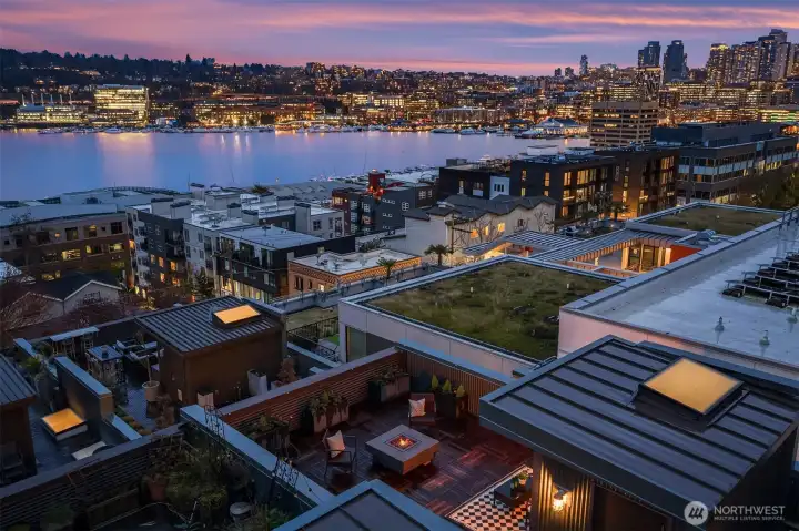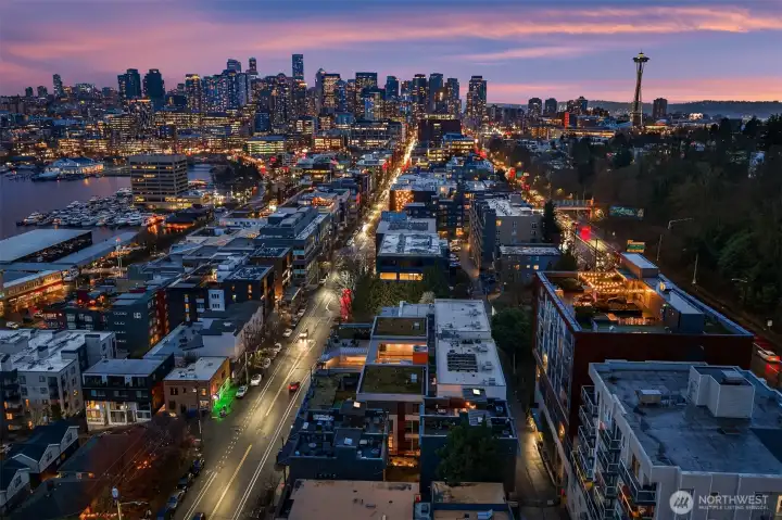 This edgy industrial end unit townhome is sited in an unbeatable location on the Eastside of Queen Anne. Perched above Lake Union and only blocks to South Lake Union & Fremont the in-city central location makes for easy car free commuting to work and play. Features include commercial grade construction, exposed steel cross beams, soaring 25’ ceilings, walls of glass comprising floor to ceiling commercial grade windows, exposed mechanical systems, bamboo floors, maple stairs, a gas fireplace & warm wood beams throughout. Enjoy the panoramic views of Lake Union, the City and Space Needle from the roof top deck at the end of a hard day or weekend relaxing. The gourmet kitchen is made for entertaining with Pental quartz counters & appliances by Bertazzoni, Bosch, Liebherr and Smeg. A Lofted Primary suite & two ensuite bedrooms make a 3 bedroom/3.5 bath home. Concrete, wood panels, metal siding and a cross braced steel frame make up the exterior of The Block condominiums. This home is located at the SW corner of the Boutique 6-unit complex and shares only one wall. Attached large, private 2 car garage of 341sf approx will accommodate your vehicle and storage needs. Your systems include a new heat pump in 2025 providing air conditioning, a new roof in approx 2015, & a tankless on demand hot water heater. HOA dues include building maintenance, water, sewer, garbage, insurance & reserves. Pre-inspected for your convenience.