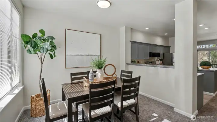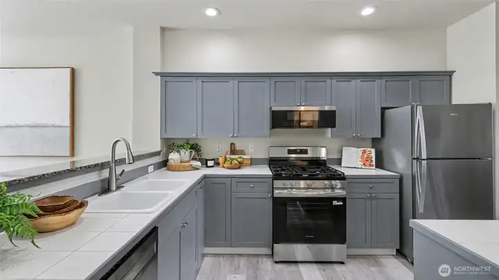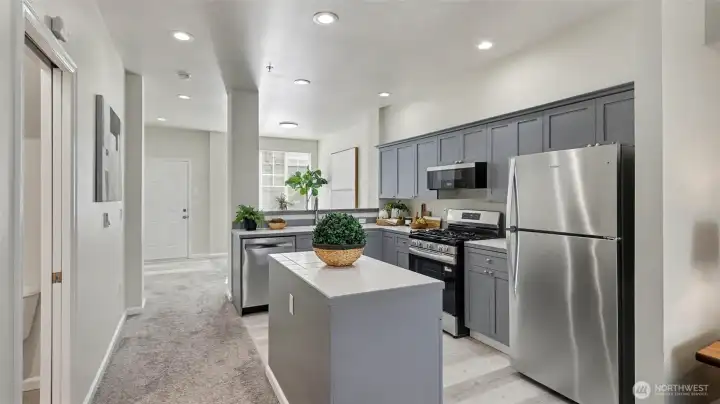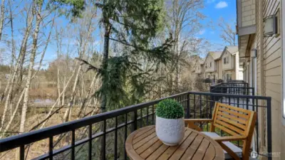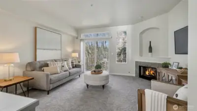 Immaculate 2-bedroom, 2.5-bath townhome in desirable Kirkland offering comfort, style, and convenience. The open kitchen features tile countertops, an island with breakfast bar, and new kitchen appliances, flowing into the dining and living areas, ideal for everyday living and entertaining. The living room is highlighted by a new gas fireplace, creating a warm and inviting space. Radiant in-floor heating, powered by a new Gas Combi Boiler for Hot Water & Radiant Heat that provides heat, keeps the home comfortable year-round. Step outside to a private deck overlooking a peaceful greenbelt with partial views of Forbes Lake. Upstairs, two spacious primary suites each feature their own en-suite bathroom, along with a washer and dryer conveniently located on the same level near the bedrooms. Additional features include secure parking for two vehicles, a storage locker, and elevator access. Residents enjoy community amenities including a fitness center, clubhouse, sport court, outdoor fireplace, BBQ area, and a scenic boardwalk to Forbes Lake. Conveniently located minutes from downtown Kirkland, Totem Lake Village, dining, shopping, parks, major tech employers, and easy access to Interstate 405. Pet-friendly up to 2 dogs/cats max 40lbs each. No rental cap and no special assessments, an excellent opportunity for homeowners or investors. Watch Virtual Tour