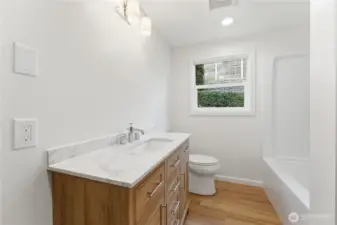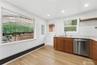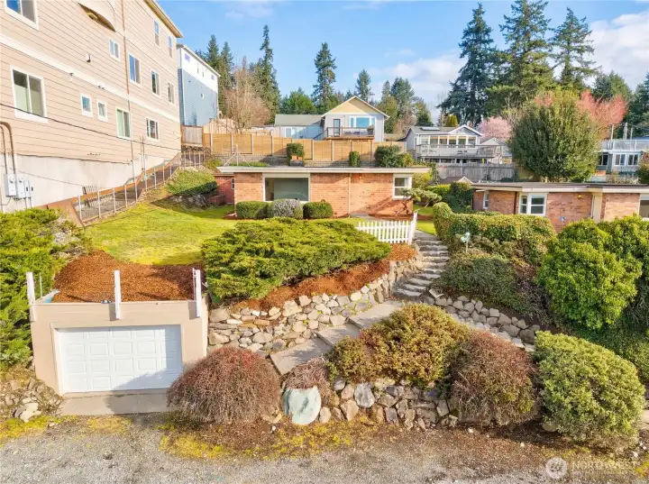 Charming mid-century brick rambler nestled near the shores of Lake Washington in coveted Kenmore. Watch seaplanes and bald eagles glide over Lake Washington right from your living room, bringing a true Pacific Northwest experience home every day. Thoughtfully remodeled from top to bottom, this move-in ready 2BR/1BA home blends timeless character with fresh modern finishes throughout. New luxury vinyl plank flooring flows seamlessly through bright, open living spaces anchored by a classic fireplace with ceramic tile hearth. The updated kitchen shines with new countertops, warm wood cabinetry, floating shelves, and stainless steel appliances. The spa-inspired bath features a marble-top vanity and soaking tub. Yard with mature landscaping, raised garden beds, stone retaining walls, and a detached 1-car garage offer room to relax and entertain. New energy-efficient water heater included. Close proximity to Lake Washington waterfront, parks, dining, and easy freeway access — this is PNW living at its finest.