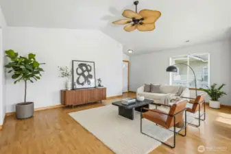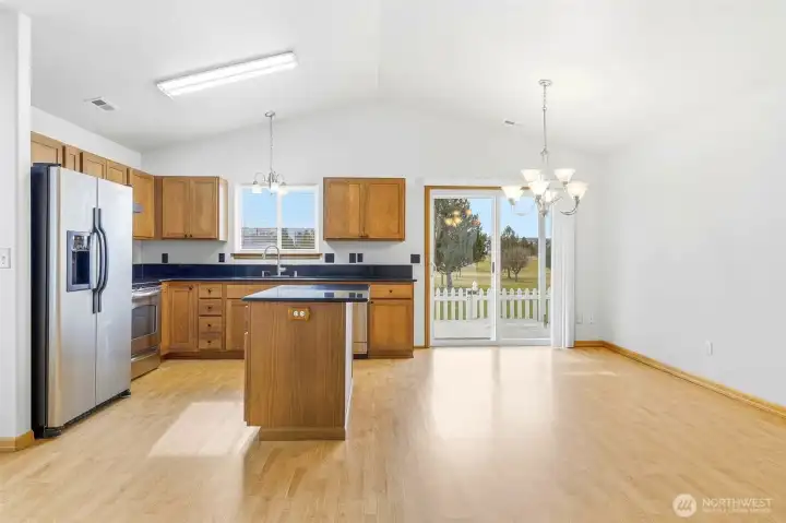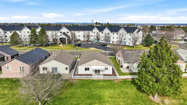 Backs directly to Hanson Park in Kennewick with private gate access from your deck to the park and walking trail just below. Enjoy peaceful, unobstructed park views from the kitchen sink, dining room slider, and primary bedroom with no neighbors behind you. This zero-step home is built on slab and offers easy, single level living with a great room layout, quartz counters, and abundant natural light. Fresh interior paint and brand-new carpet make it truly move in ready. All appliances stay, including refrigerator, washer, and dryer. Heat pump was replaced in the last few years for efficient heating and cooling. Rare opportunity for direct park access, privacy, and convenient living close to schools, shopping, and everyday amenities.