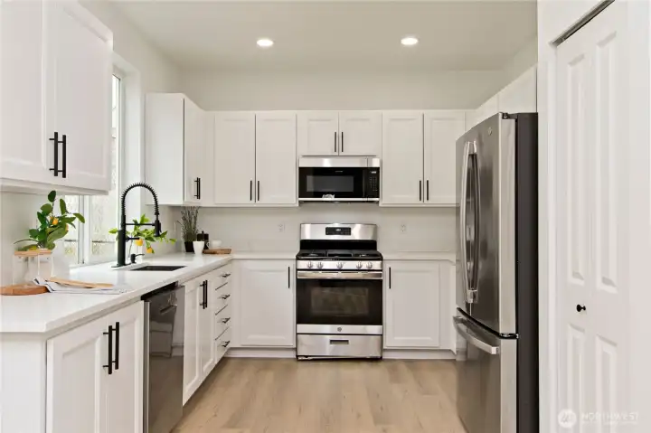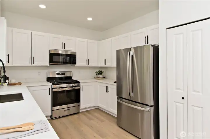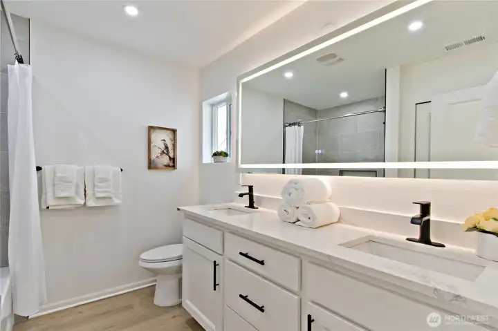 Stunning 1,620 SqFt home featuring 3 bedrooms and 2.5 baths. Step inside and fall in love with the open floor plan, vaulted ceilings, and designer finishes throughout. The main floor offers a spacious family room and dining area plus a beautiful living room with a tiled surround fireplace open to the brand-new kitchen featuring white cabinetry, quartz countertops, and stainless steel appliances. Head upstairs to the spacious primary bedroom with a large walk-in closet and private bath featuring a new quartz vanity and tiled tub surround. The second floor also features 9’ ceilings, two additional bedrooms, and a versatile bonus area. The main bath includes a new vanity and tiled tub surround. Additional upgrades include new flooring throughout, fresh interior paint, updated lighting, and modern fixtures. Enjoy the oversized back patio and fully fenced yard, perfect for entertaining. Conveniently located near schools, shopping, amenities, and easy access to Hwy 167 & 405.