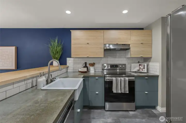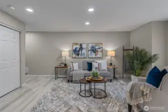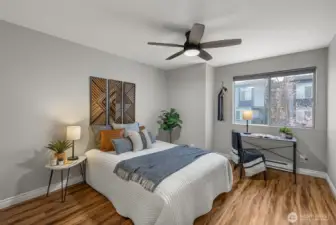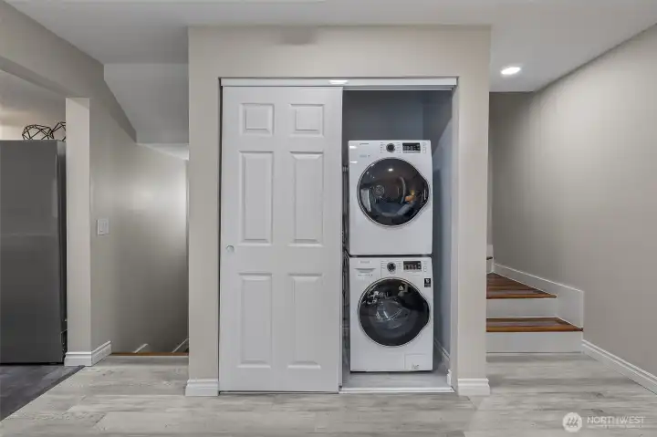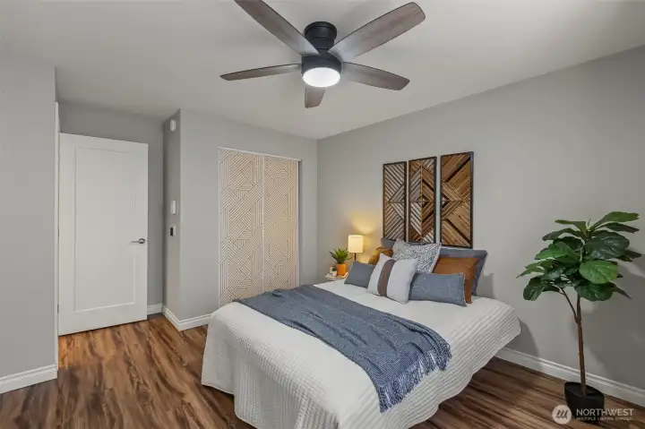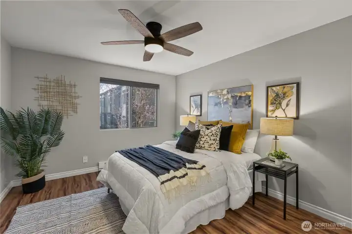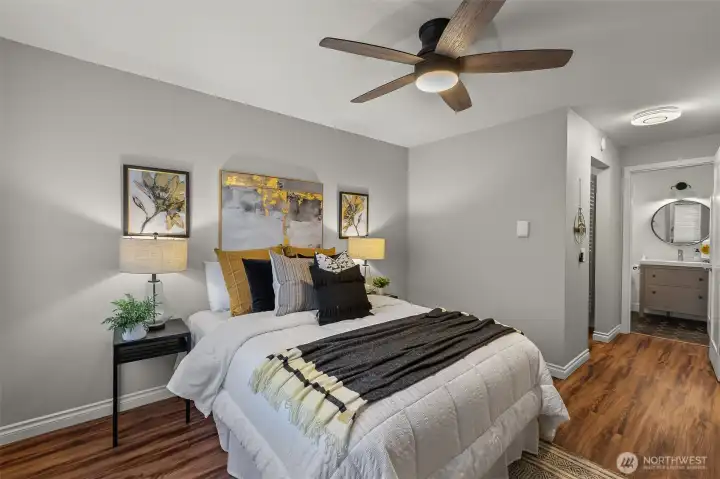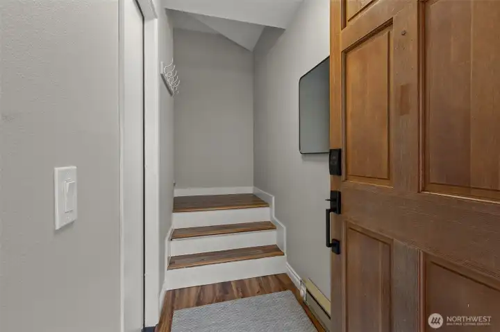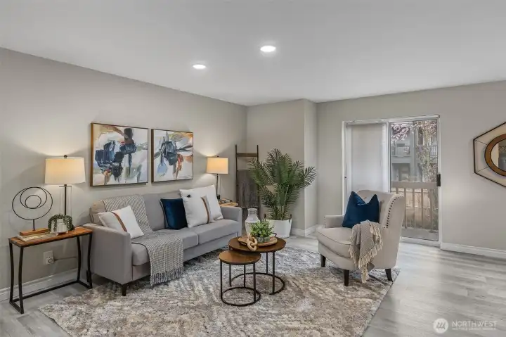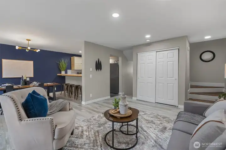 Renovated 2-bed, 2-bath townhome with 2-car garage in a small, quiet community just minutes to amenities. Lives large with spacious open-concept living area, continuous LVP flooring, and two sliding doors leading to a private deck. Updated kitchen features modern cabinetry, farmhouse sink, stainless steel appliances, and room to expand workspace or storage. Upper level includes two bedrooms and two updated bathrooms, including a primary suite with a walk-in closet with custom organizers, and an updated bath with modern tile and walk-in shower. Deep 2-car garage offers under-stair storage plus ample wall and ceiling space for custom storage. Garage plumbing allows flexibility for future laundry relocation; laundry currently on the main floor. Plenty of guest and street parking, minutes to unlimited amenities, and I-5, all around convenience. Welcome home!