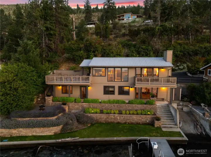 Exceptional Lake Chelan waterfront retreat featuring 70' of pristine low-bank frontage, a private Trex dock, boat lift, and pebble beach. This 4 bed, 2 bath, 1,795 sq ft home offers expansive lake views from two spacious decks and a serene lower patio. Enjoy a level, manicured lawn at the water’s edge—perfect for lakeside entertaining. Located on a quiet, tree-lined street with generous off-street parking. A rare opportunity to own a premier waterfront retreat offering privacy, comfort, and effortless access to Lake Chelan’s crystal-clear waters.