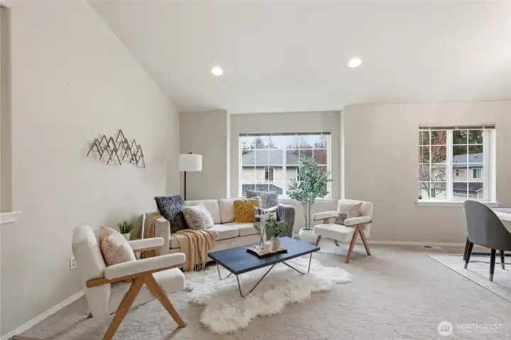 Welcome to the peaceful comfort of this home in a privately gated community of just 18 homes. Situated on a corner lot, the flexible layout offers 2 bedrooms, 1 bath, kitchenette, and bonus space on the main level—ideal for MIL living, guests, or house-hack potential. Upstairs features bright, vaulted living spaces with a spacious kitchen and eating area, open living and dining areas, and a cozy family room with gas fireplace—perfect for everyday living and entertaining. Step onto the private balcony with composite decking to relax and unwind. This level also includes an additional bedroom and a primary suite with a walk-in closet featuring a built-in closet system and a bathroom with new LVP flooring. Recent updates include NEW carpet, NEW furnace with 10-year warranty, 2022 roof with 20-year warranty, and 2020 water heater. Extra finished room off the 2-car garage adds flexibility. HOA covers gate and landscaping. Conveniently located near parks, trails, beaches, Boeing, Paine Field Airport, and easy access to Hwy 99, I-5, and 405. Located in the award-winning Mukilteo School District.