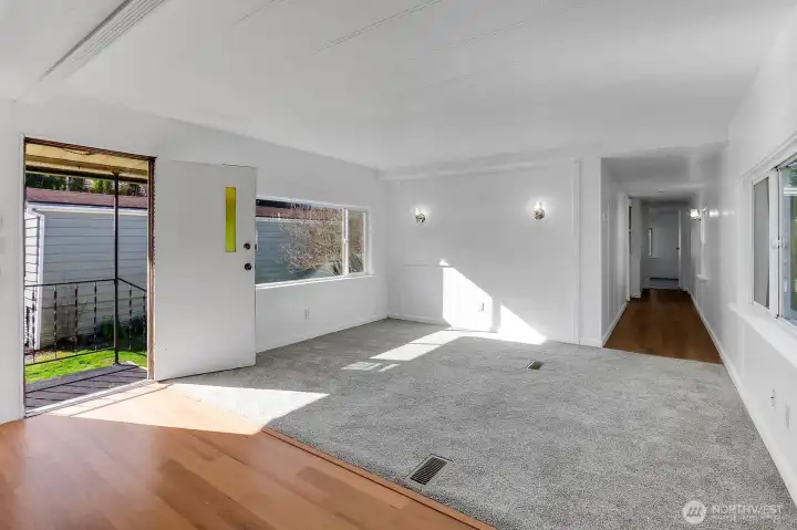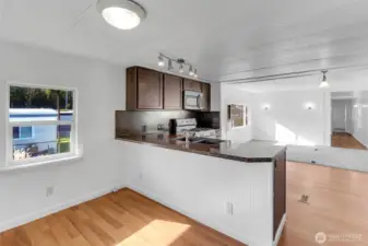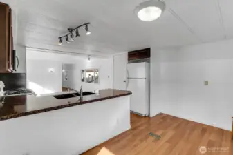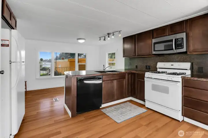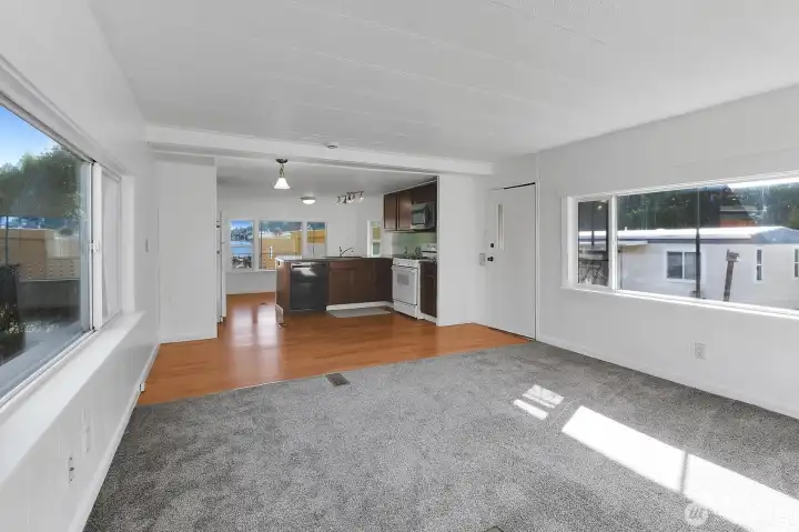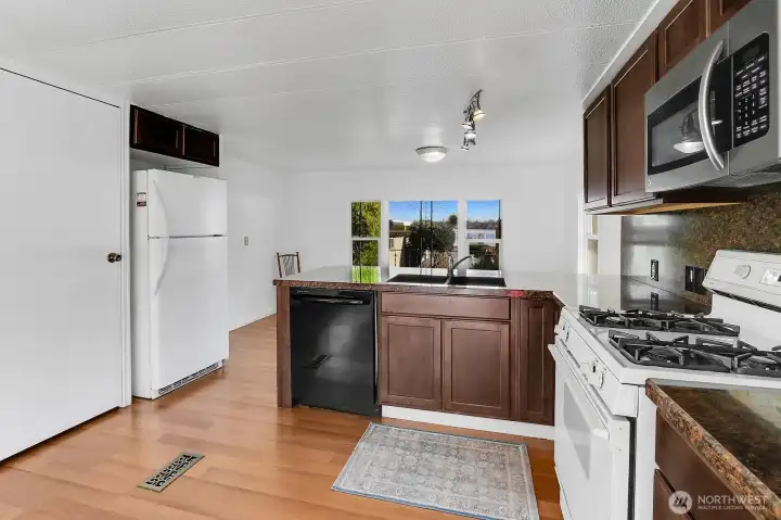 Lake views and peaceful 55+ living await at Lake Meridian Estates. This well-maintained 1973 home offers scenic views of Lake Meridian and Mt. Rainier from the kitchen and dining room space, creating a beautiful backdrop for your morning coffee or evening meal. The light-filled open-concept layout connects the spacious kitchen, dining area, and living room—perfect for easy everyday living and entertaining. Recent upgrades add comfort and value, including fresh interior paint, new furnace, roof refininishing, new washer, new lighting fixtures throughout, and new LVP flooring in the entry. Durable vinyl windows improve efficiency and brightness. The covered carport includes an 8x10 Tuff Shed with ramp, providing convenient storage or hobby space. Outside, enjoy a small, easy-care yard ideal for relaxing or gardening without heavy maintenance. Residents of Lake Meridian Estates, a welcoming 55+ community, enjoy access to shared community spaces perfect for social gatherings, hosting events, and connecting with neighbors. Conveniently located near shopping, dining, parks, and everyday amenities, this home combines lake-view living, low-maintenance lifestyle, and community connection in one inviting package. Perfect for buyers searching for 55+ homes with lake views, open floor plans, updated systems, and low-maintenance living near Lake Meridian. Lot rent includes Water, Sewer, & Garbage. The park offers a small number of under 55+ so if you are over 40, call this place home.
