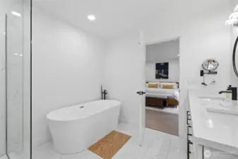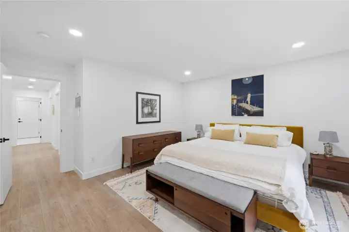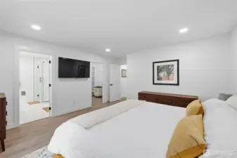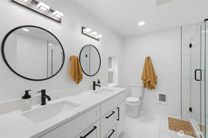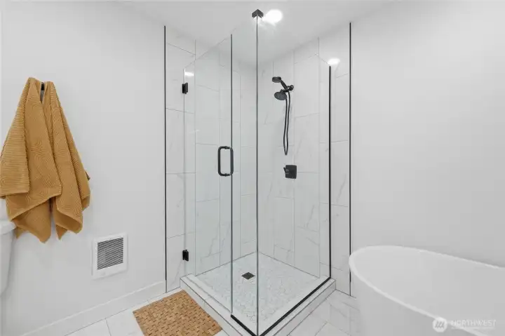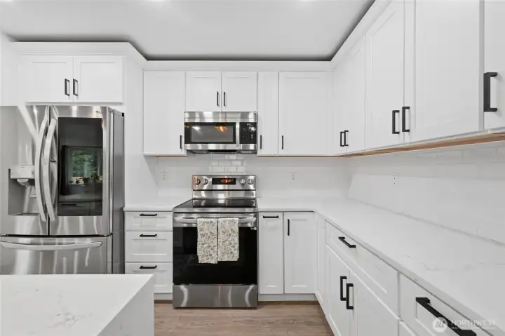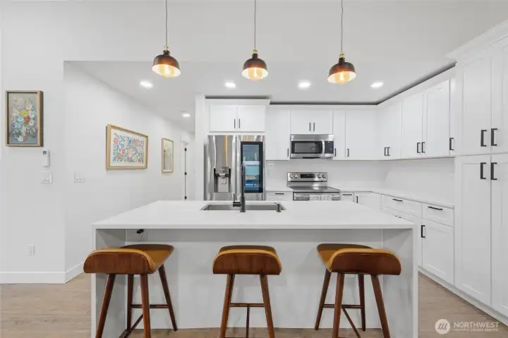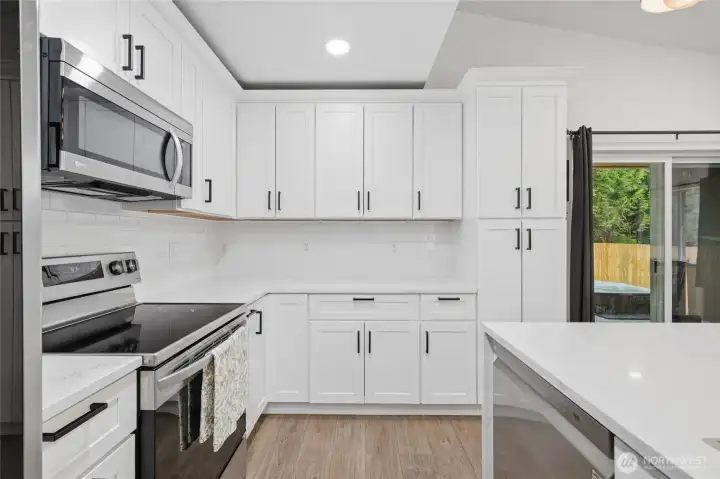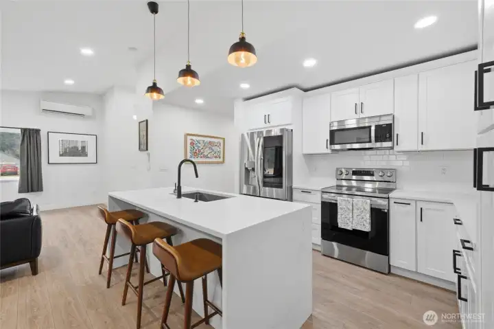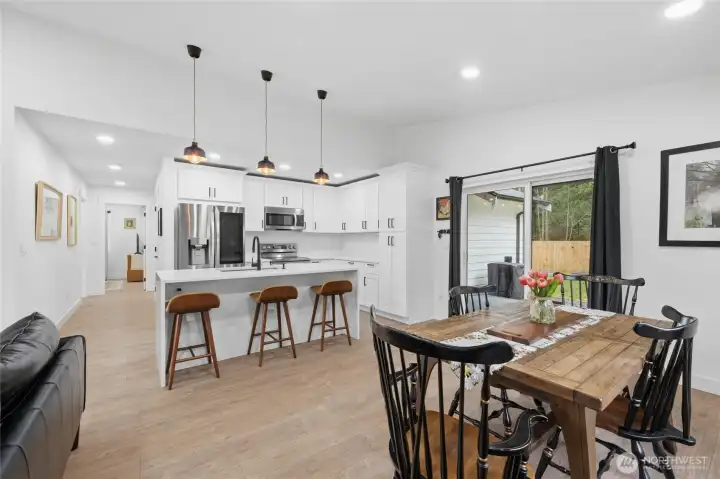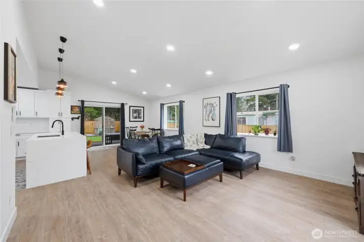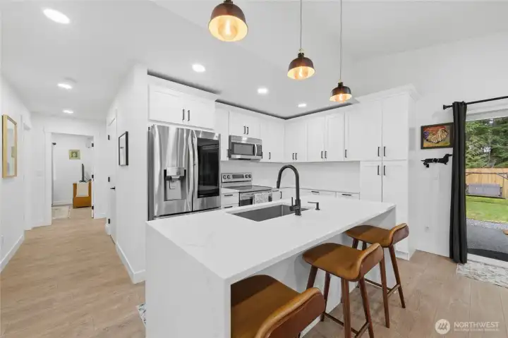 Gorgeous high-end 3 bedroom, 2 bathroom home situated on a level lot with a bright open floor plan and soaring cathedral ceilings. The living area is filled with natural light and flows seamlessly into the modern kitchen featuring white cabinetry, quartz countertops, island seating, a waterfall island, and beautiful easy-care flooring throughout. The spacious primary suite offers a huge walk-in closet and a luxurious five-piece bath with a freestanding soaking tub and separate glass-enclosed shower. Enjoy outdoor living year-round on the covered exposed aggregate patio overlooking the fully fenced backyard. The yard offers plenty of garden space with raised garden beds, a greenhouse, and a newer hot tub-perfect for relaxing or entertaining. A larger driveway provides ample parking and includes EV charging capability. Energy-efficient features include a hybrid electric water heater and a highly efficient 4-zone Daikin heat pump providing both heating and A/C. Conveniently located just 20 minutes from the Canadian border.