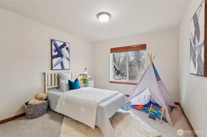 Welcome to Inglemoor Court where comfort meets convenience in this beautifully maintained 4-bedroom, 2.5-bath home with a spacious two-car garage. Designed for easy Northwest living, the open-concept great room flows seamlessly from the kitchen and overlooks a private, low-maintenance backyard featuring artificial turf - perfect for enjoying the Pacific Northwest climate year-round without the upkeep. This northeast-facing home is filled with natural light, thanks to soaring vaulted ceilings and skylights that create an airy, inviting atmosphere. The primary suite offers a cozy fireplace retreat — the perfect place to unwind at the end of the day. Additional highlights include: Tesla wall charger in the garage, newer heat pump for efficient, year-round comfort & residents-only community park. This home truly combines thoughtful updates, functional living space, and modern convenience all in a welcoming community setting!