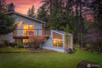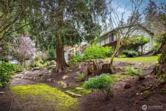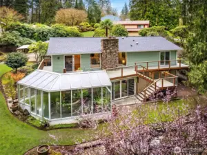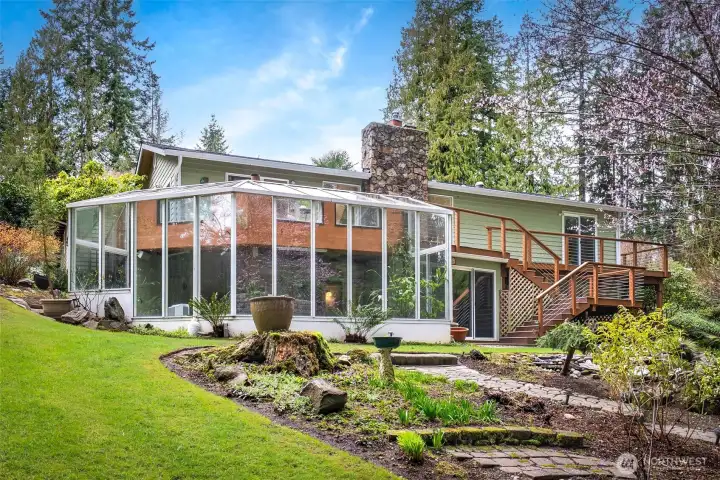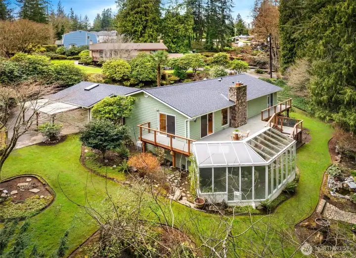 Tucked between Mill Creek Town Center and Martha Lake, this Bothell home offers the rare combination of privacy and convenience on just over an acre of park-like property without sacrificing daily necessities. The home sits down a long driveway surrounded by lush landscaping and towering trees that create a secluded setting. Inside, fresh interior paint, newly refinished oak hardwood floors, and new carpet guide you throughout. The kitchen offers ample storage and prep space for everyday cooking or entertaining, and the spacious dining room opens directly to the back deck for effortless summer hosting. Evenings will be spent relaxing in the living room, enjoying views of the property. The main-floor primary suite boasts private deck access, a sitting nook, generous closet space, and an ensuite bathroom. A secondary bedroom and nearby hall bath complete the main level. Downstairs, a large bonus room awaits with additional living space and a tranquil solarium, the perfect space to relax or nurture your green thumb. You will also find two additional bedrooms, a full bathroom, a laundry room, and oversized storage for easy organization. Outside, the property continues to impress with a garden shed, multiple park-like areas for outdoor living, and simply enjoying the beauty of the PNW.