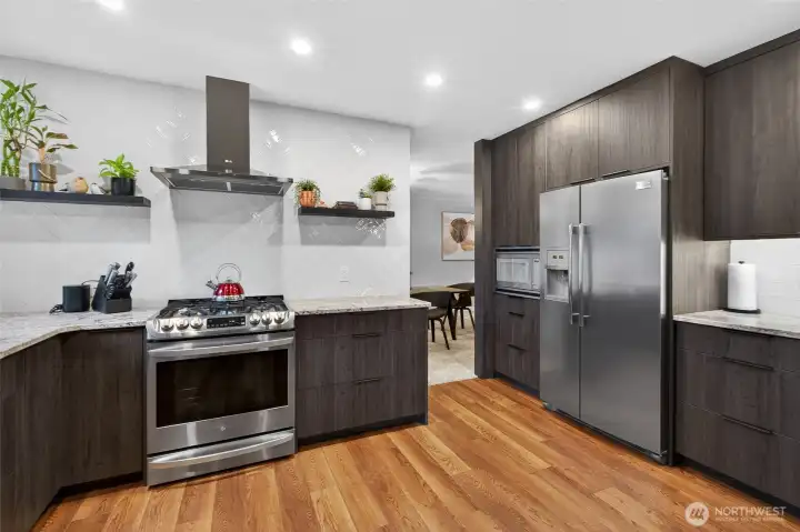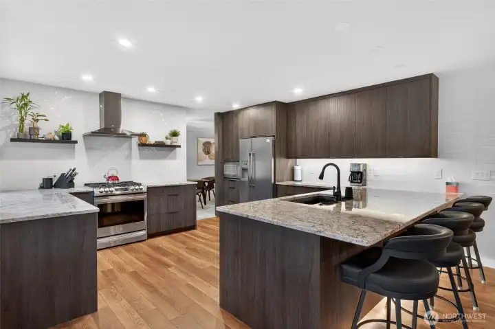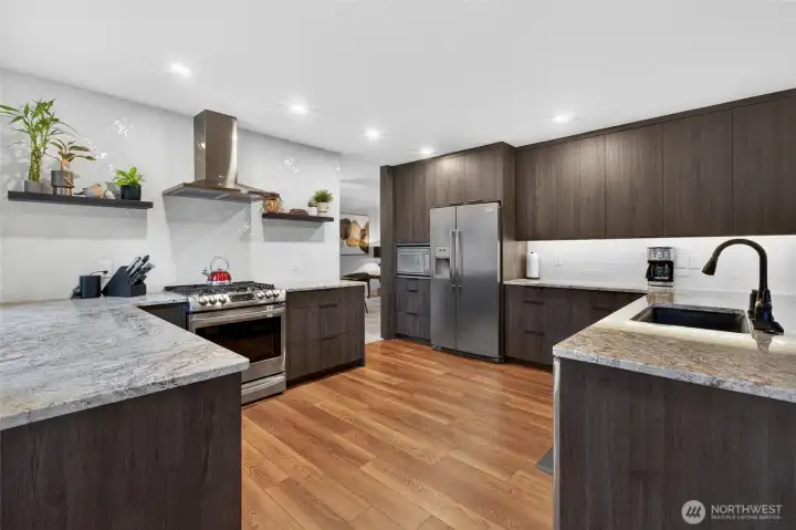 Stunningly updated and exceptionally versatile, this Semiahmoo custom home offers over 4,000 square feet of refined living space designed to accommodate a wide range of lifestyles. The centerpiece of the home is a true chef’s kitchen, completely rebuilt with brand-new cabinetry, fixtures, countertops, backsplash, flooring, sink, and a new six-foot window that floods the space with natural light. Centrally located and beautifully connected to the breakfast nook and main living areas, it is both a showpiece and the functional heart of the home. With the potential for primary suite living on the main level in addition to the expansive upstairs primary, the layout offers rare flexibility, while multiple rooms allow the home to live as a 4-bedroom residence or provide space for up to 7 bedrooms or flex rooms. The upstairs primary suite features a luxurious updated five-piece bath and adjoining nursery, office, or fitness room. Outside, a full-length deck and patio overlook the fully developed, sun-drenched, low-maintenance backyard, where a pond, waterfall, and mature perennial landscaping create a private and peaceful retreat. Recent upgrades include a new roof, fresh interior and exterior paint, updated flooring, stacked-stone fireplace surround with mantle, travertine bath finishes, furnace, tankless hot water system, and updated lighting. HUGE attached 1,256 SQFT 4-car garage with shop space adds the finishing touch to this exceptional Semiahmoo offering.