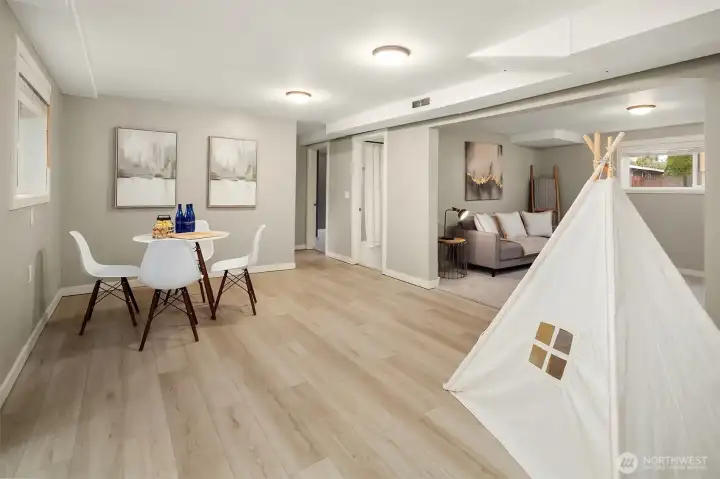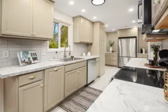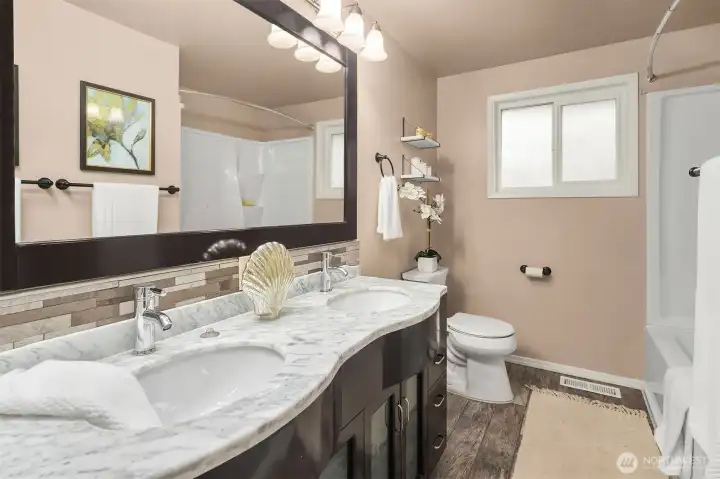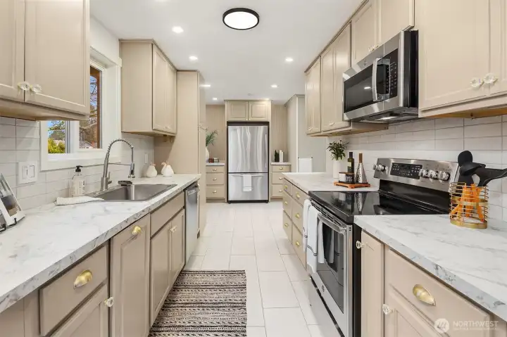 Nestled on a quiet dead-end street in Edmonds, this 5-bed, 2.5-bath split-level home offers bright, open living w/ hardwood floors throughout the main level. Stylish galley kitchen features stainless steel appliances, subway tile backsplash, & ample shaker-style cabinetry. Deck off the dining area makes it easy to extend entertaining outdoors. Downstairs the expansive family/rec room opens through a sliding door to a fully fenced, level backyard complete with a fire pit and a putting green for golf enthusiasts. Large laundry/utility room with sink is conveniently located on the main level. Additional highlights include a two-car attached garage and a prime location just minutes from the Edmonds Bowl, ferry, local boutiques, and nearby schools.