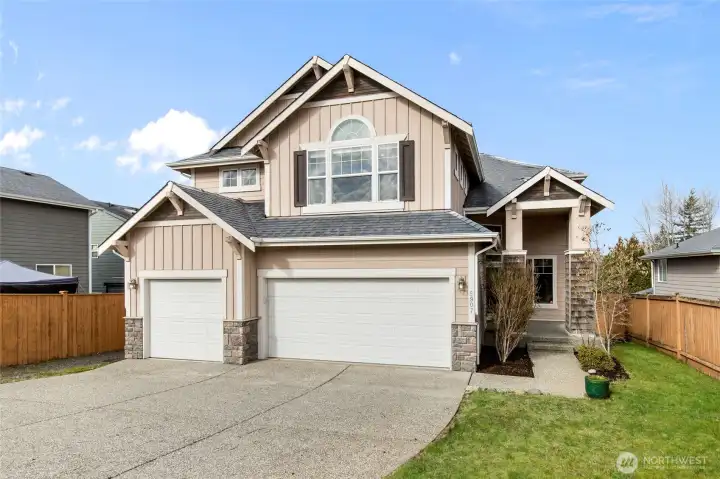 Welcome home to the coveted Palisades community, where this stunning 3,193-square-foot home sits perfectly at the end of a quiet cul-de-sac. The Hardiplank exterior and inviting covered porch lead into a bright, two-story entryway filled with natural light and fresh interior paint. The main level is designed for both productivity and elegance, featuring a private den with French doors and formal living and dining spaces adorned with custom millwork and columns. Gleaming hardwoods guide you to the heart of the home: an open kitchen boasting granite tile countertops, a walk-in pantry, a gas cooktop, and newer dishwasher. Relax in the adjacent family room by the stone gas fireplace or step through French doors to the large deck and fully fenced backyard. Retreat to the massive primary suite, a true sanctuary with vaulted ceilings, a cozy gas fireplace anteroom, and mountain and territorial views. The spa-like ensuite features a jetted soaking tub, dual vanities, and an expansive walk-in closet. The upper level also hosts a large bonus room with arched windows, a secondary bedroom with its own walk-in closet, and a convenient laundry room with a utility sink and newer 2025 washer and dryer. Modern comfort is guaranteed with a gas furnace, central AC, a Nest thermostat, and the three-car garage, upgraded with an electric car charger and overhead storage. This Marysville gem combines luxury, views, and peace of mind in one perfect package.