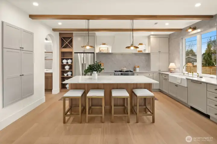 Stunning new construction by A&M Luxury Homes. Designed for modern Living, crafted with timeless quality. Blending modern luxury with Craftsman style in Seattle’s sought-after Ravenna neighborhood. Light-filled interiors feature arched entryways, timber-lined ceilings, wide-plank flooring, and custom built-ins that create a warm yet sophisticated feel throughout. Designed for effortless entertaining, the open-concept great room flows seamlessly into a chef’s kitchen with professional-grade appliances, oversized seating island, abundant cabinetry, marble and soapstone surfaces, and a fully equipped butler’s pantry offering exceptional prep & storage space. Main-level office or den with nearby ¾ bath provides ideal flexibility for remote work or guest accommodations. Upstairs, retreat to the luxurious owner’s suite with private balcony, spa-inspired bath, and walk-in closet. Three additional bedrooms and a well-appointed full bath. A bonus room that is also a legal ADU with private entrance includes a kitchenette, living area, and fifth bedroom & bathroom—perfect for multigenerational living, guests, or potential rental income. Enjoy a level, fully fenced yard and wraparound patio ideal for outdoor dining & entertaining. Located on a quiet, tree-lined Ravenna street just minutes to the University of Washington, Seattle Children’s Hospital, parks, Green Lake, cafés, shopping, & top-rated schools with convenient access to transit & major commuter routes.